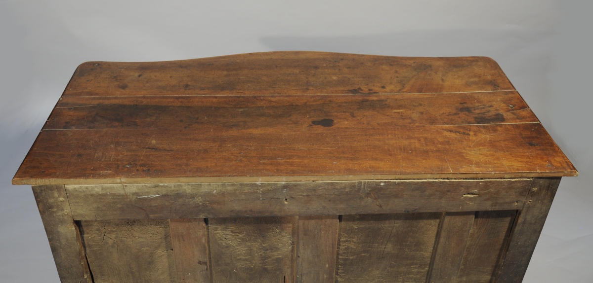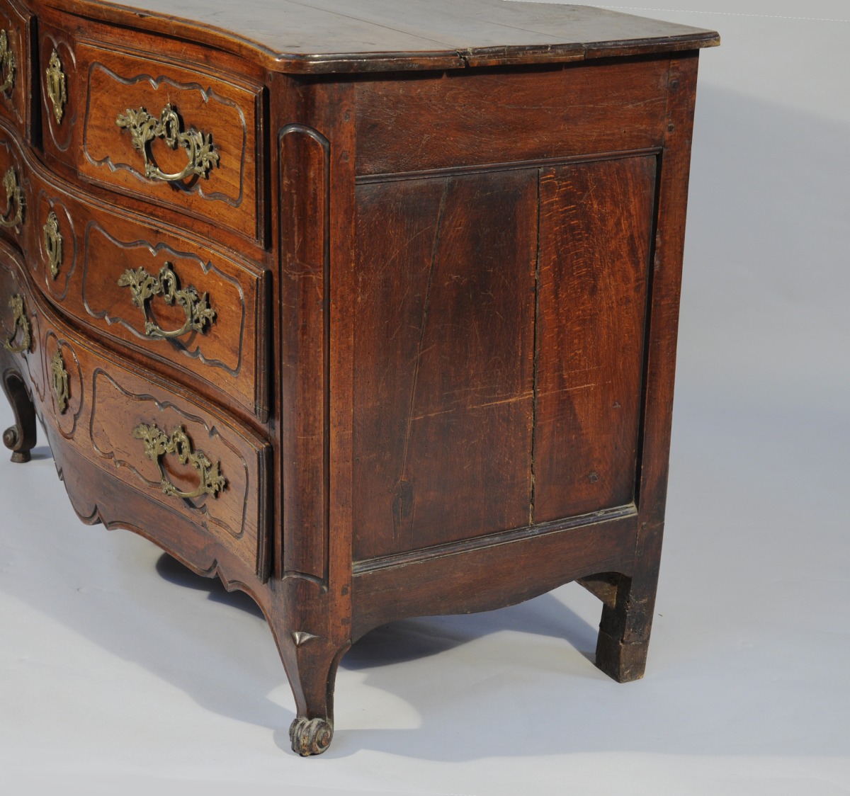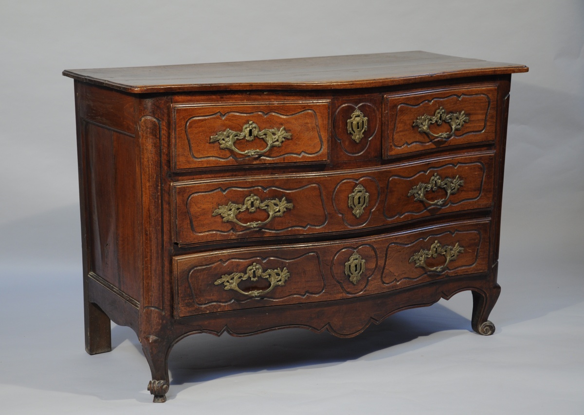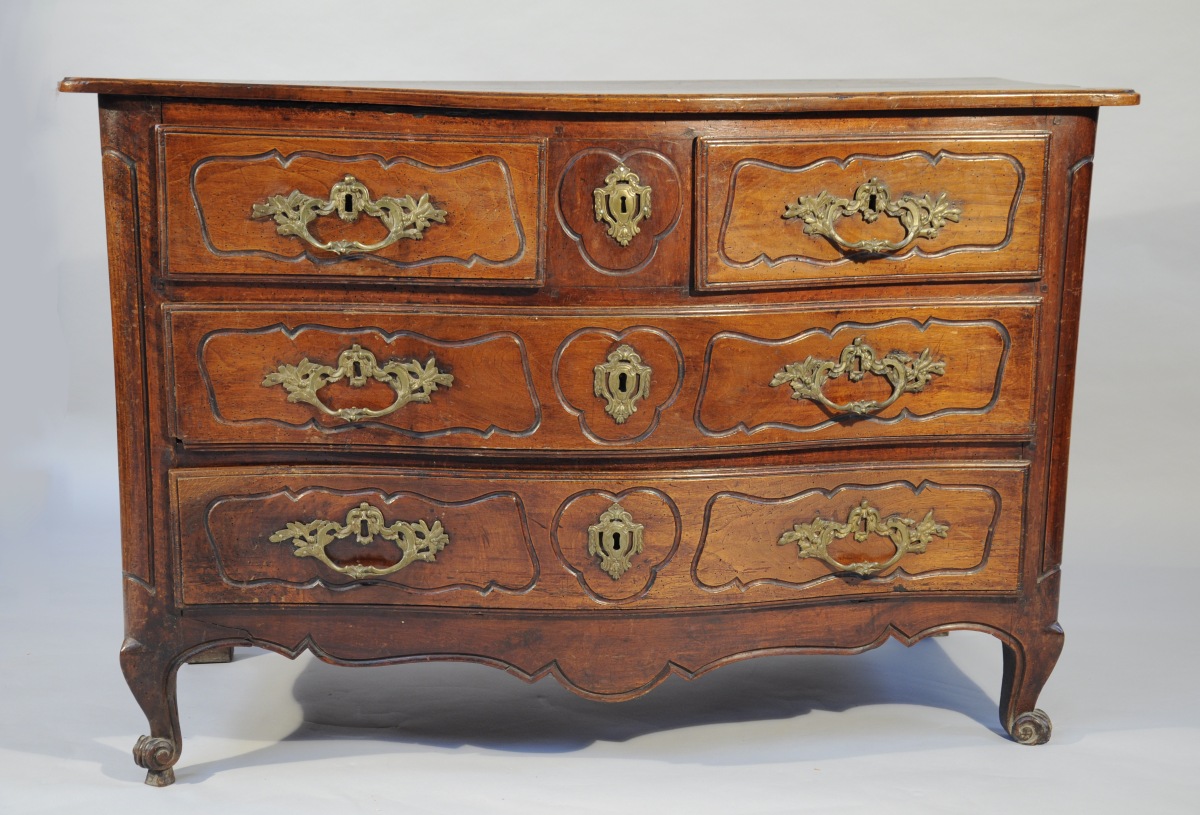 COMMODE à façade mouvementée en bois naturel mouluré. Elle ouvre en façade par quatre tiroirs sur trois rangs. Traverse basse chantournée et pieds antérieurs à enroulement. Garniture de bronzes feuillagés telle que entrées de serrure et poignées de tirage.