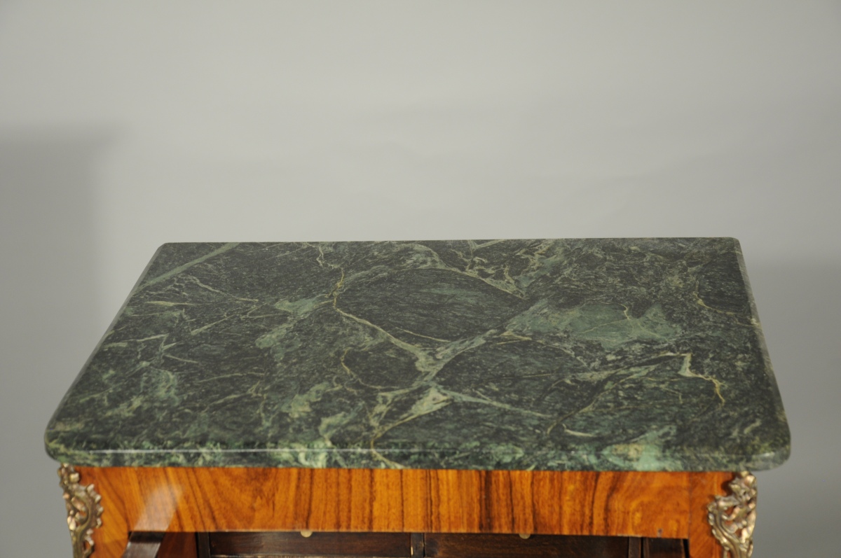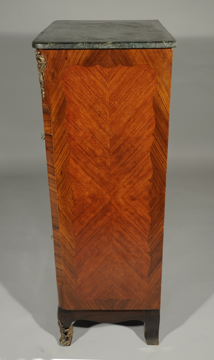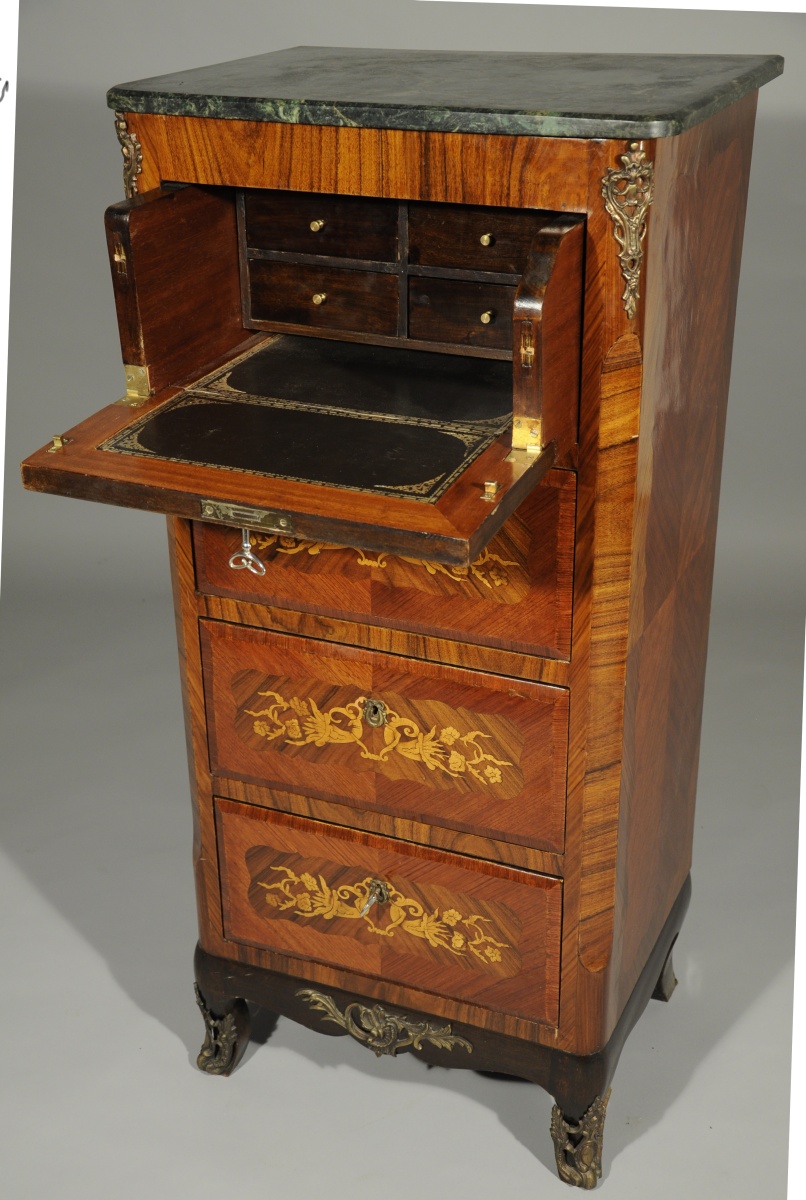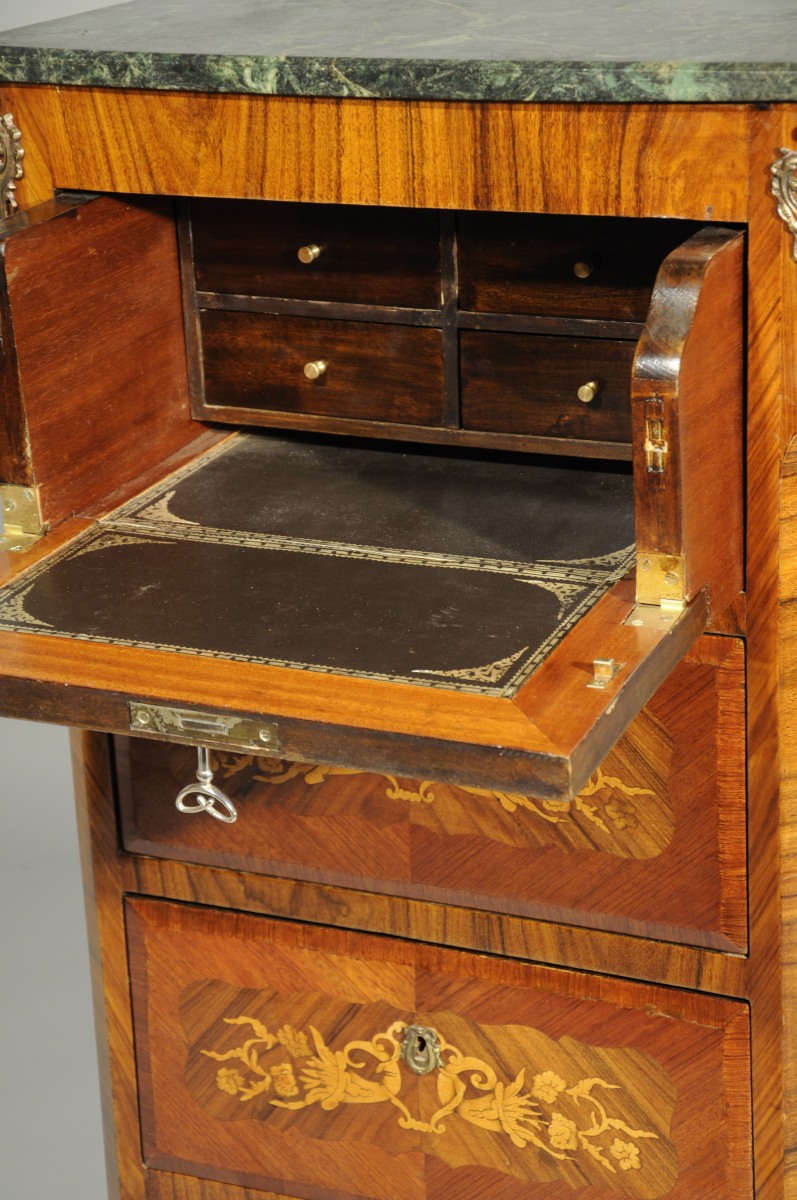 SECRÉTAIRE vertical de forme rectangulaire en placage de bois de rose. Il ouvre en façade par un petit abattant découvrant quatre tiroirs, et trois tiroirs ornés d'une marqueterie florale à cornes d'abondance dans des cartouches chantournés. Repose sur quatre pieds cambrés. Garniture de bronzes feuillagés telle que entrées de serrure, chutes, tablier et sabots. Dessus de marbre vert de mer.