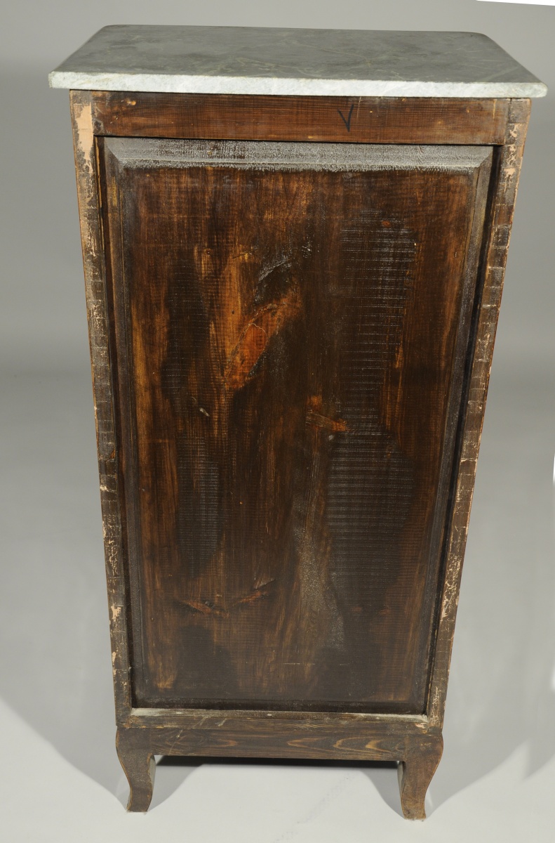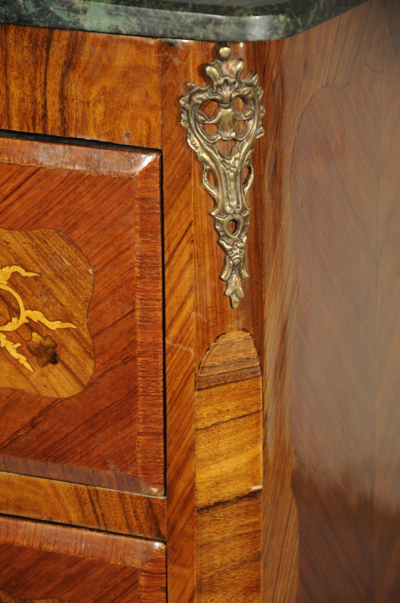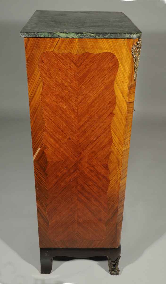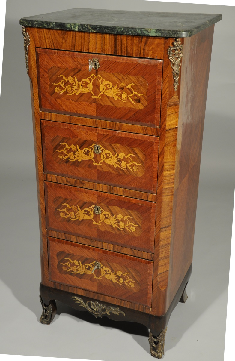 SECRÉTAIRE vertical de forme rectangulaire en placage de bois de rose. Il ouvre en façade par un petit abattant découvrant quatre tiroirs, et trois tiroirs ornés d'une marqueterie florale à cornes d'abondance dans des cartouches chantournés. Repose sur quatre pieds cambrés. Garniture de bronzes feuillagés telle que entrées de serrure, chutes, tablier et sabots. Dessus de marbre vert de mer.