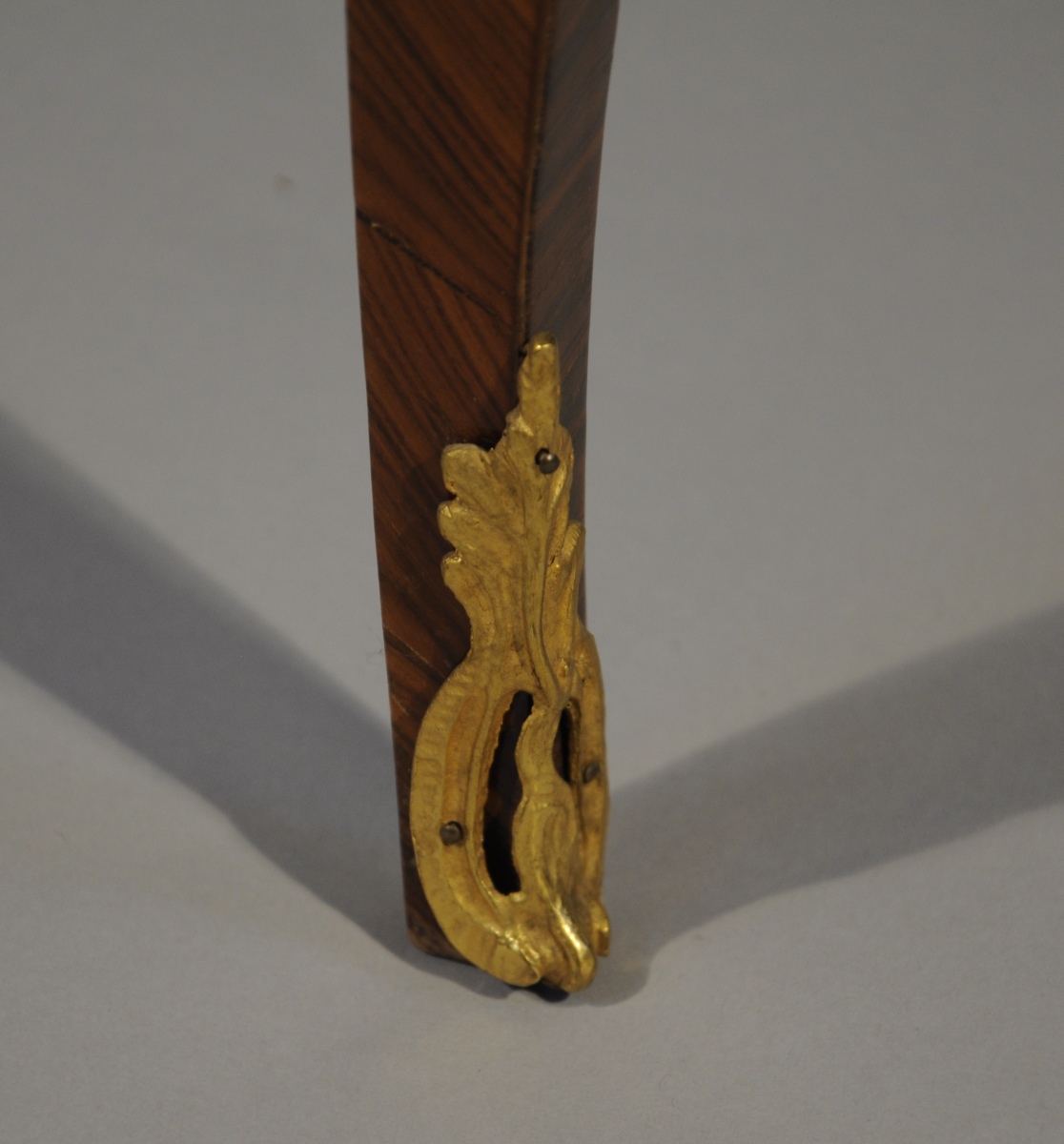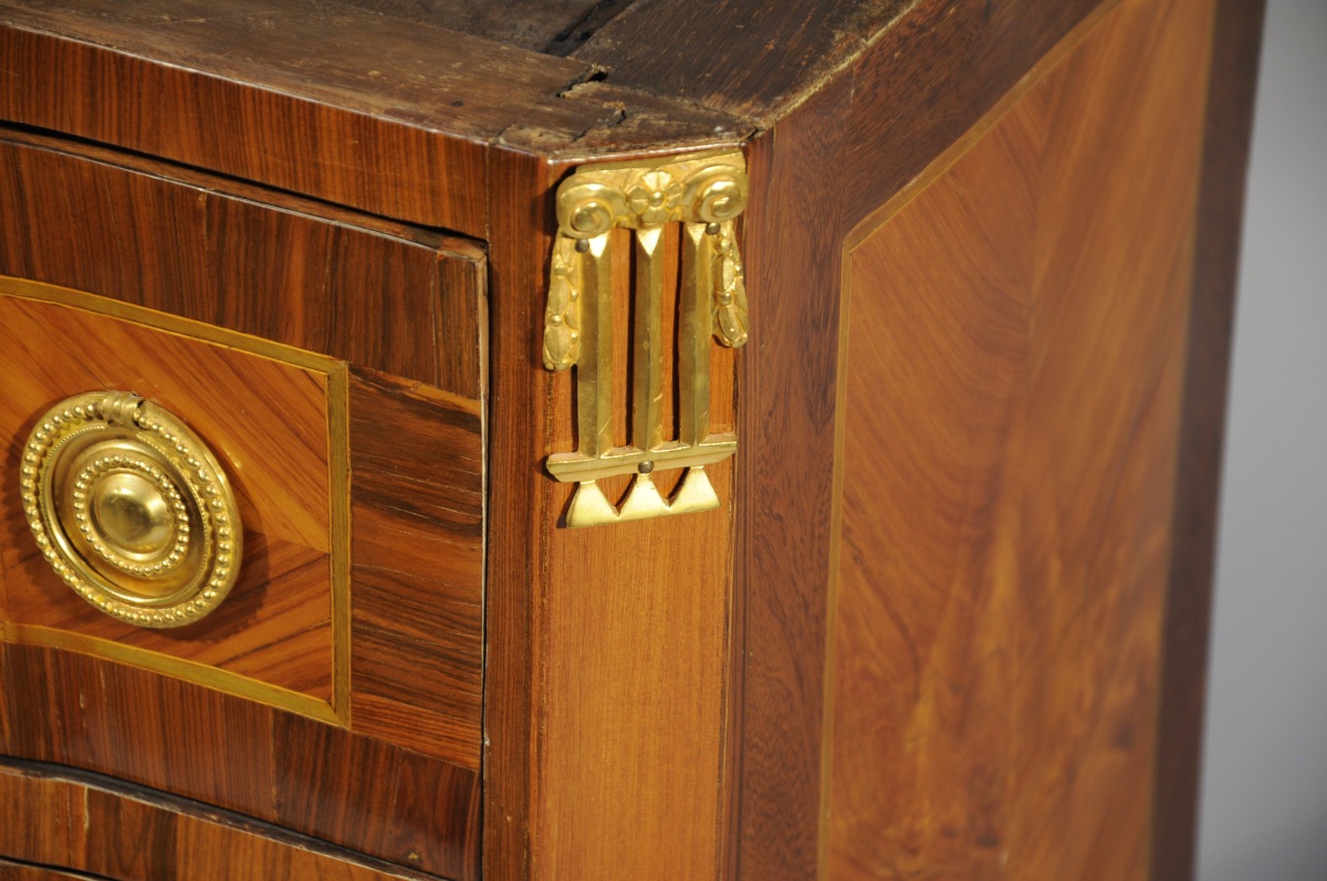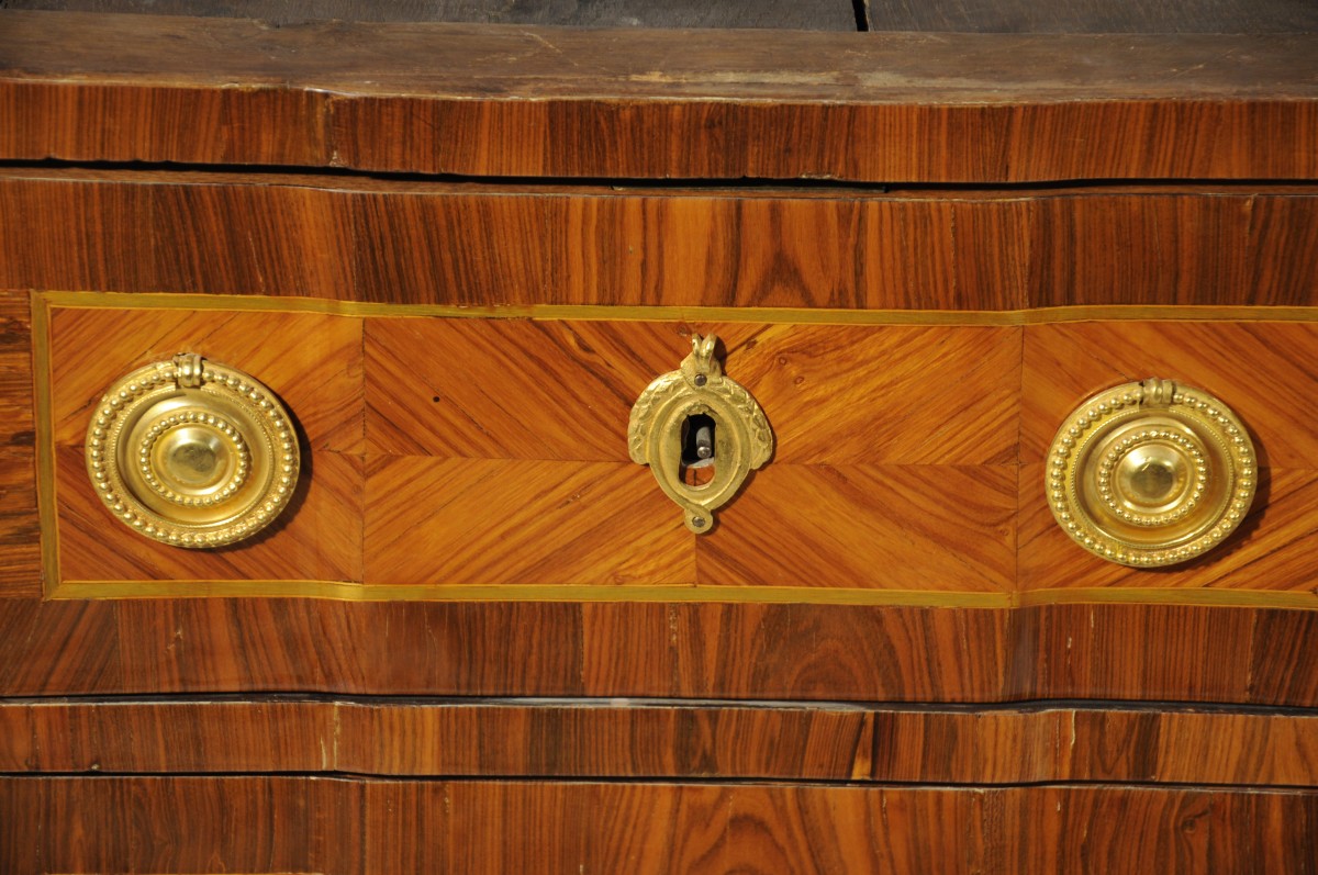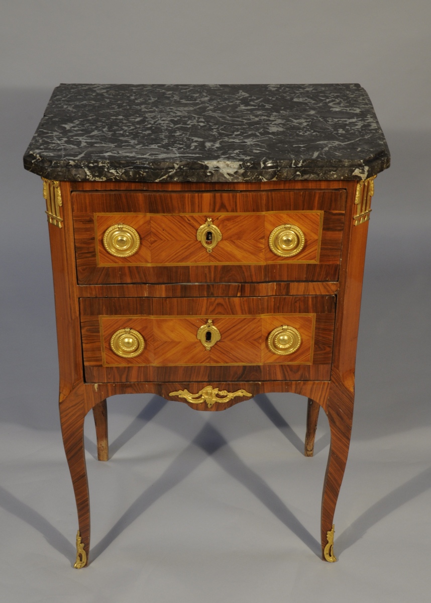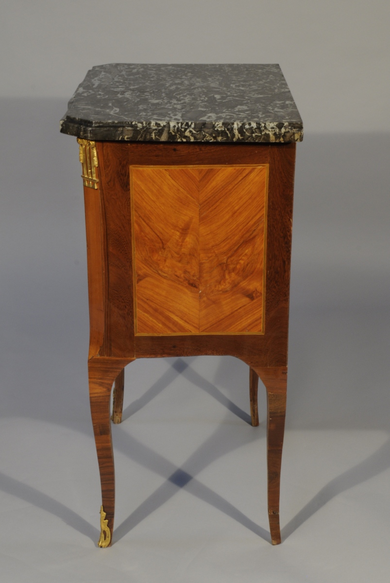 Garniture de bronzes dorés: anneaux de tirage, entrées de serrures, chutes, cul de lampe et sabots. Dessus en marbre gris veiné de blanc.