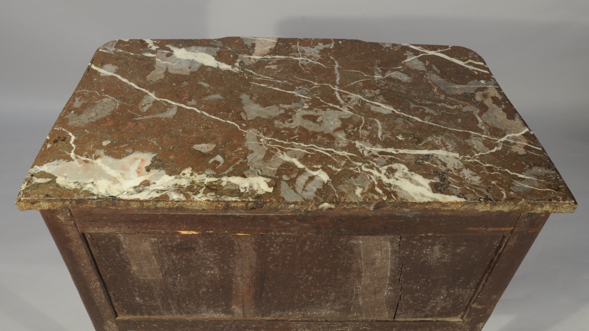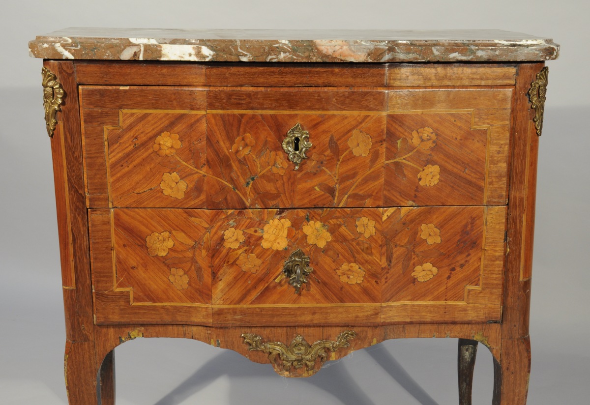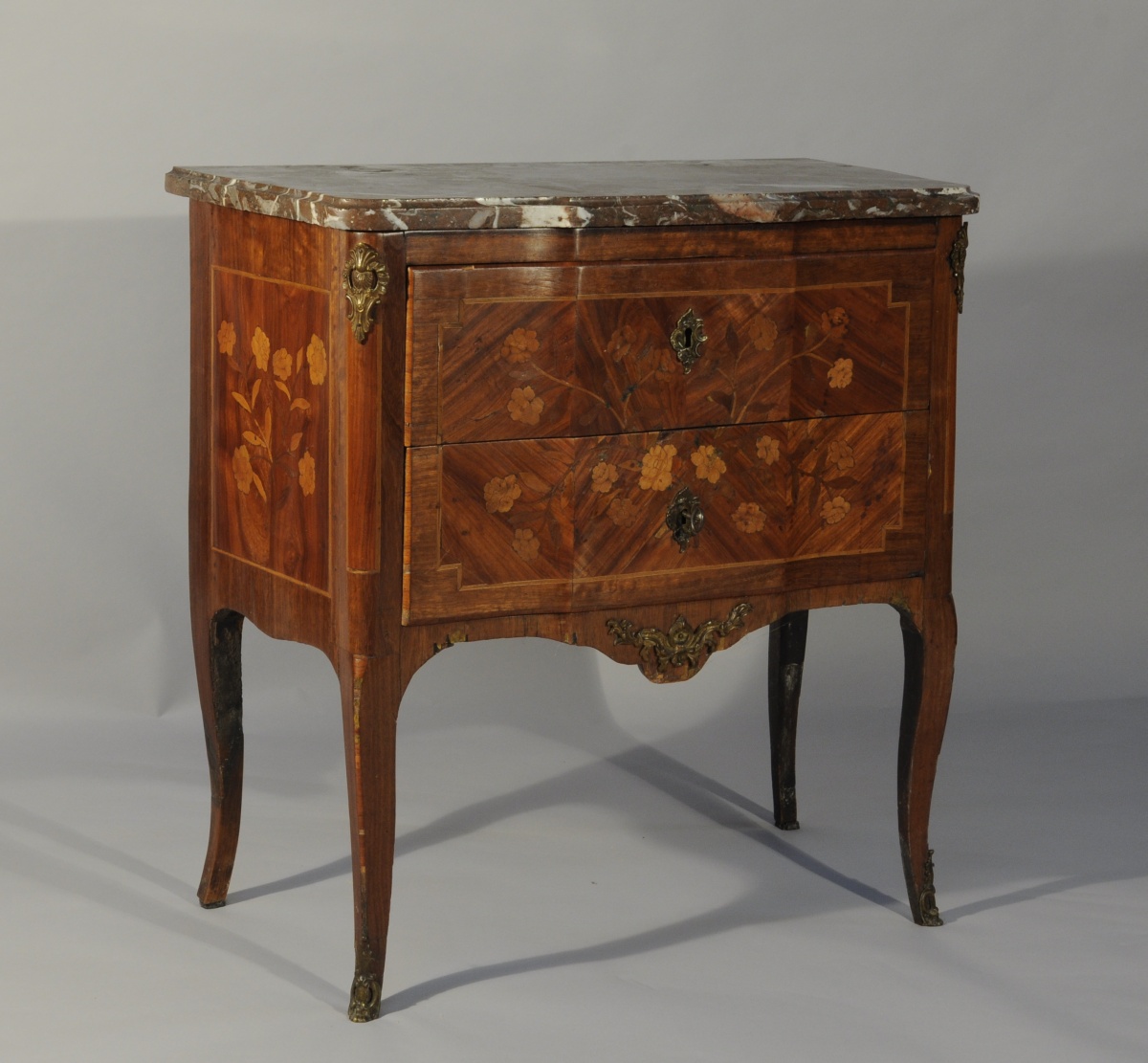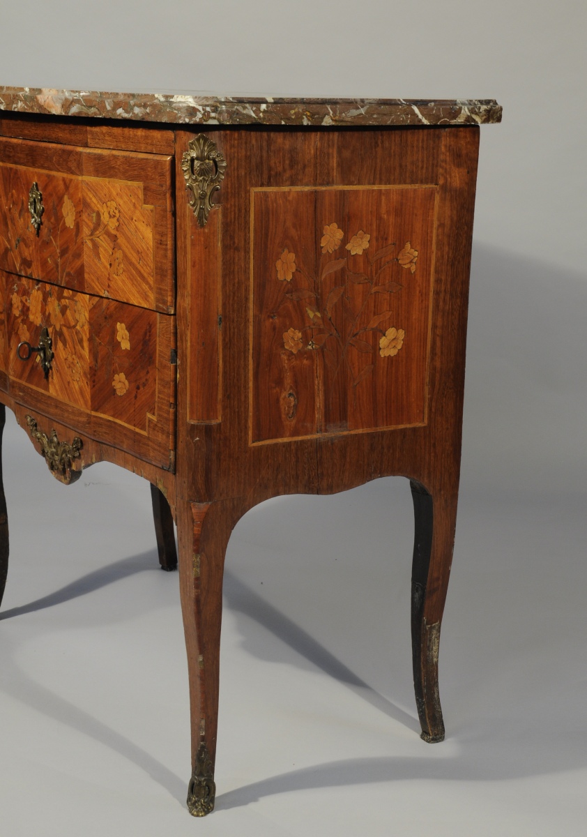 COMMODE SAUTEUSE à léger ressaut en bois de placage ouvrant à deux tiroirs en façade. Décor de bouquets fleuris en marqueterie. Elle repose sur quatre pieds galbés. Garniture de bronzes tels que entrées de serrure, chutes, cul de lampe et sabots sur les deux pieds antérieurs. Dessus de marbre rouge royal.