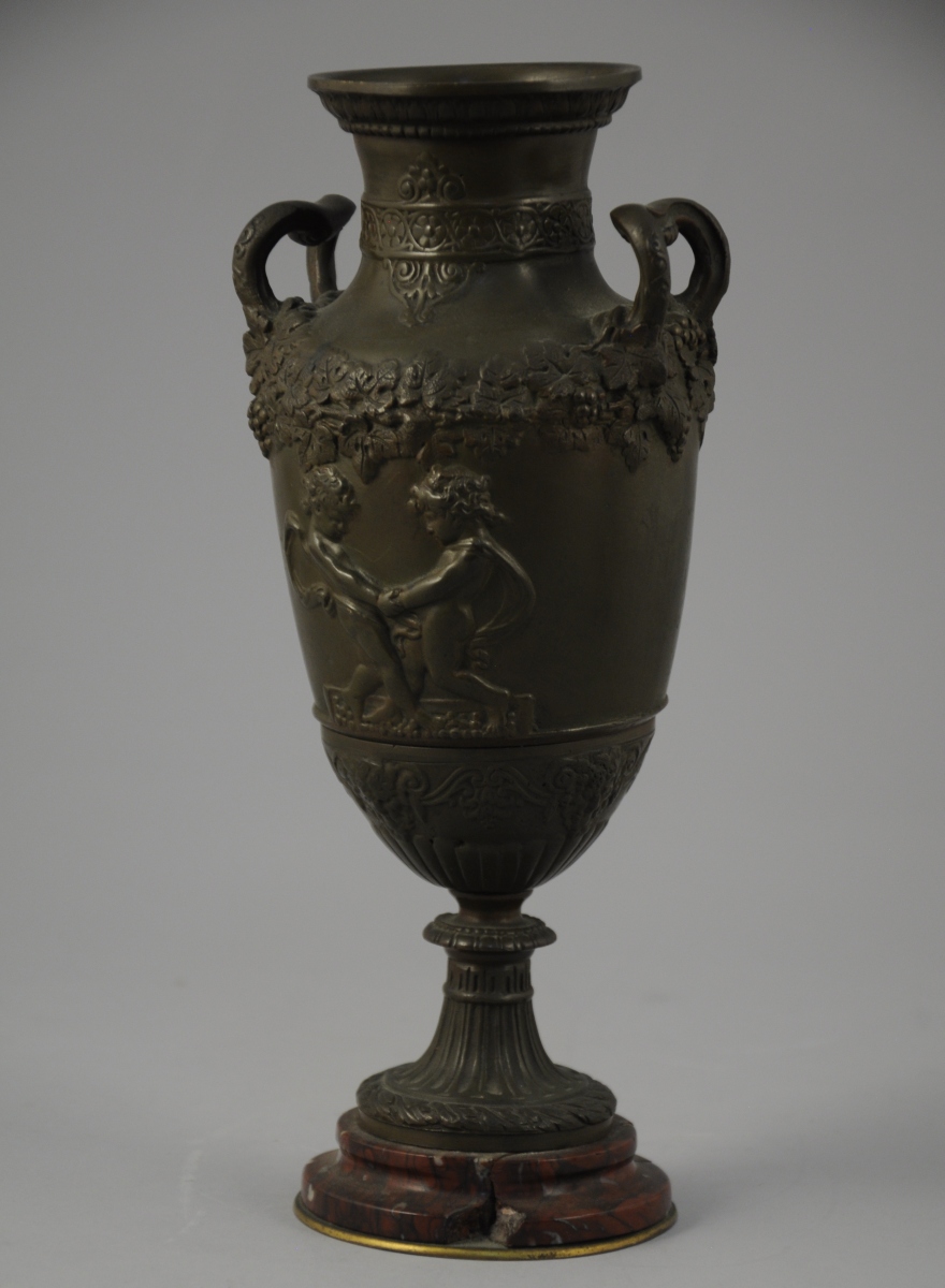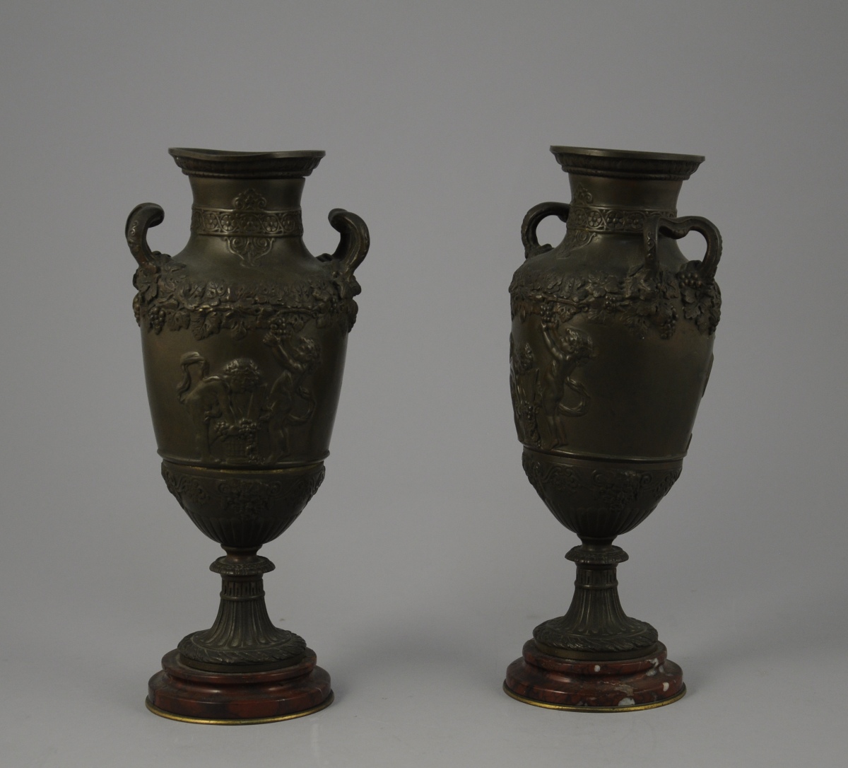 Paire de VASES ANTIQUE, de forme ovoïde, à col évasé sur pied douche à décor de feuillage et représentant des puttis vendangeurs.