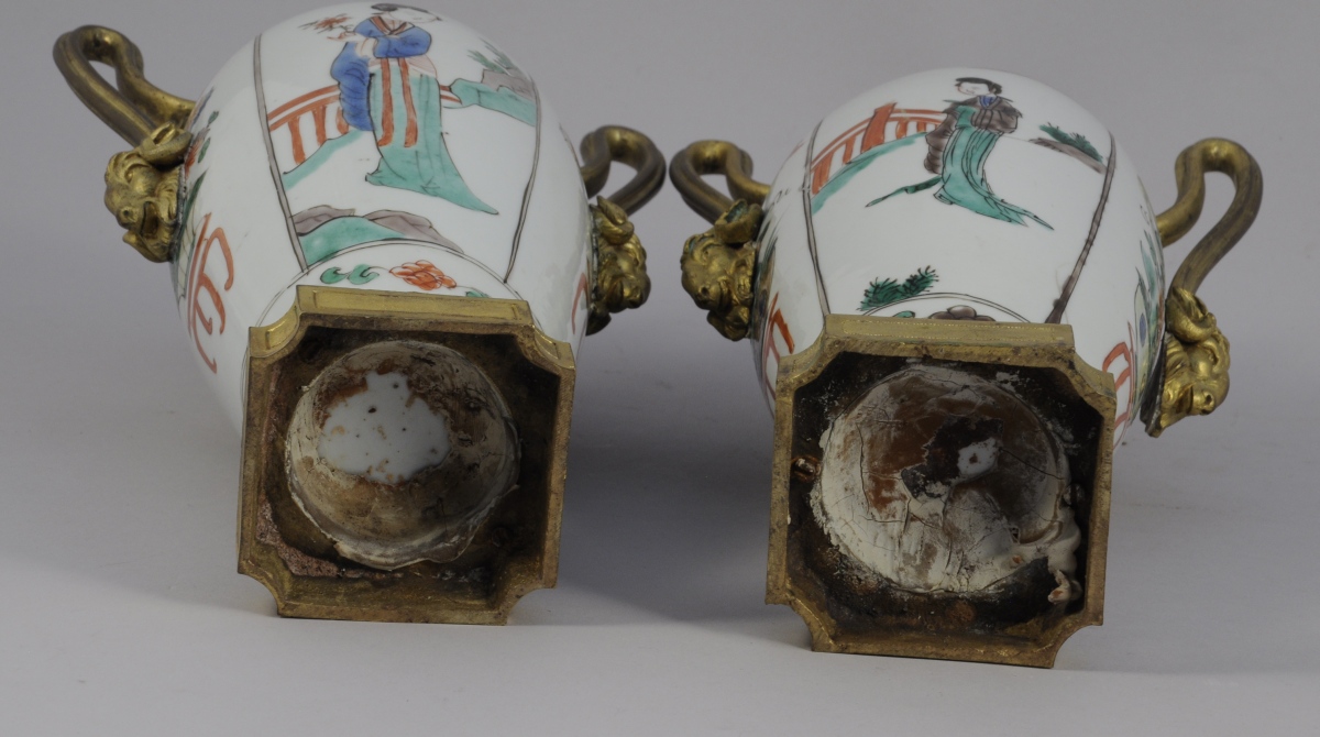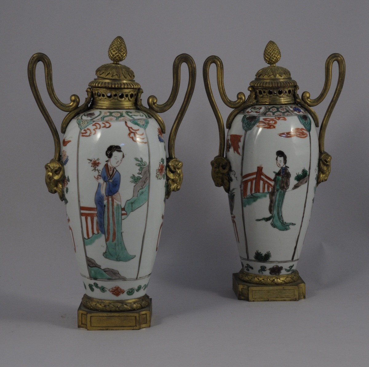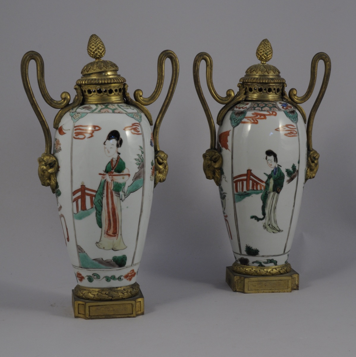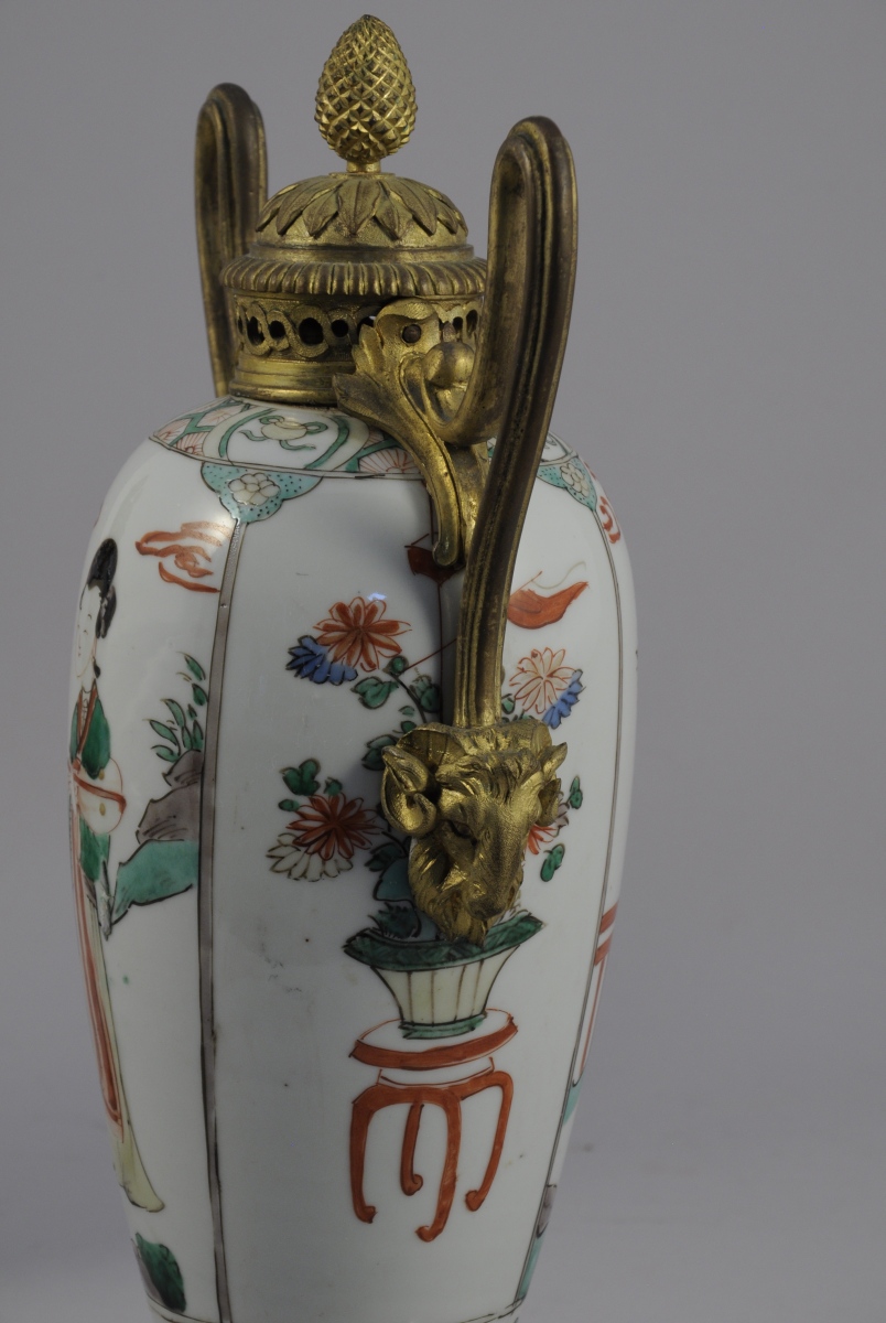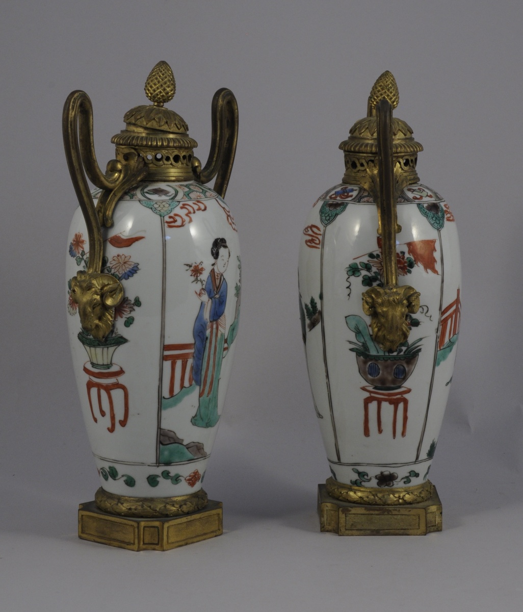 DEUX VASES pouvant former paire, en porcelaine émaillée polychrome dans le style de la famille verte à décor de personnages et de fleurs. Montés en bronze doré dans le style Louis XVI, les anses à tête de bélier, la prise du couvercle en forme pomme de pin.