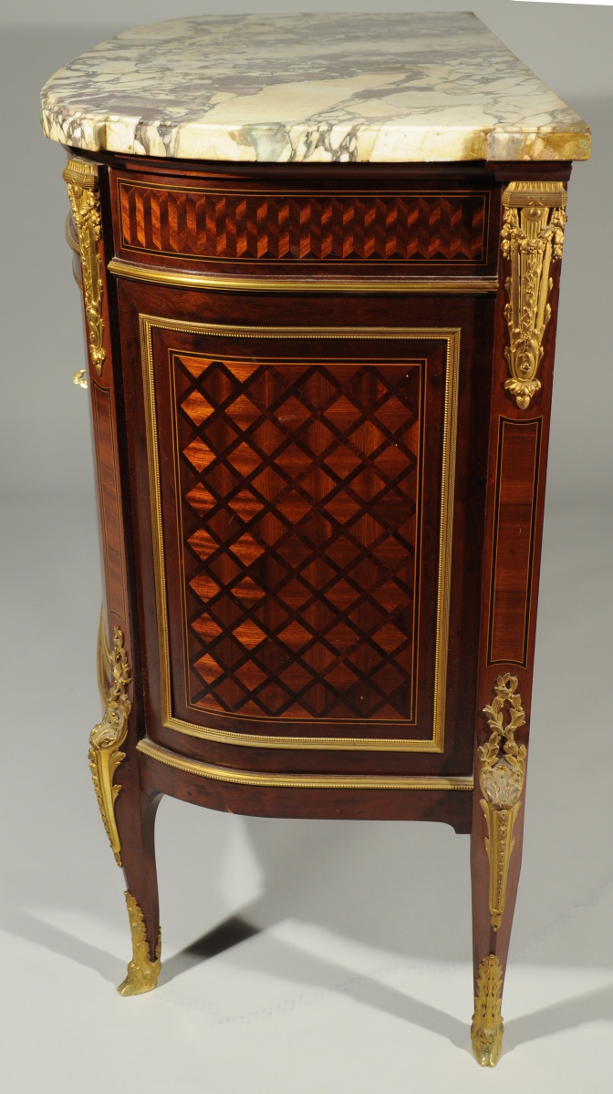COMMODE DEMI-LUNE en placage d'acajou, amarante et satiné, ouvrant en façade par deux vantaux et trois tiroirs en ceinture. Riche marqueterie de chevrons en ceinture et treillage pour les vantaux et les côtés dans un encadrement de filets d'ébène et de bois clair et baguettes de bronze guilloché. Repose sur quatre pieds cambrés. Garniture de bronzes dorés telle que frise d'entrelacs en ceinture, chutes, faux-dormant rubané et feuillagé, tablier et sabots. Dessus de marbre brèche violette.