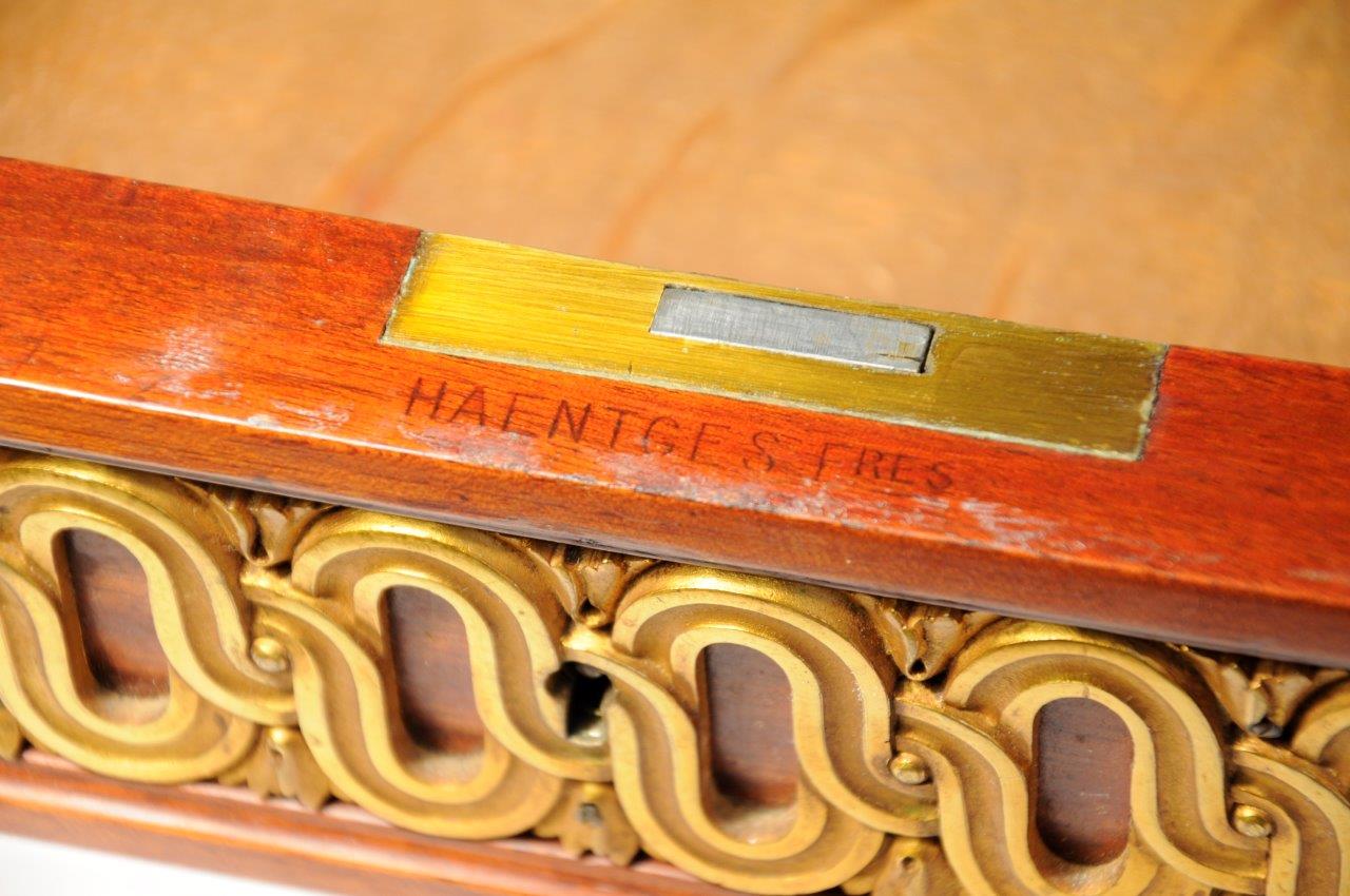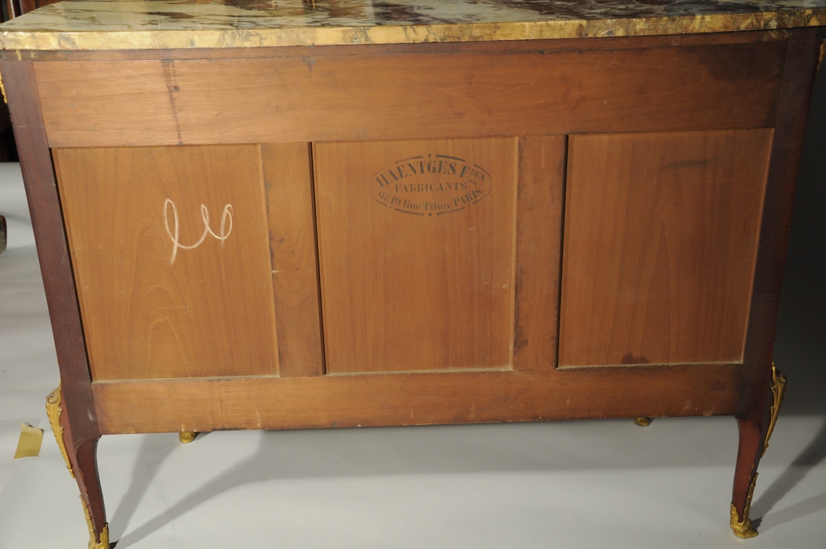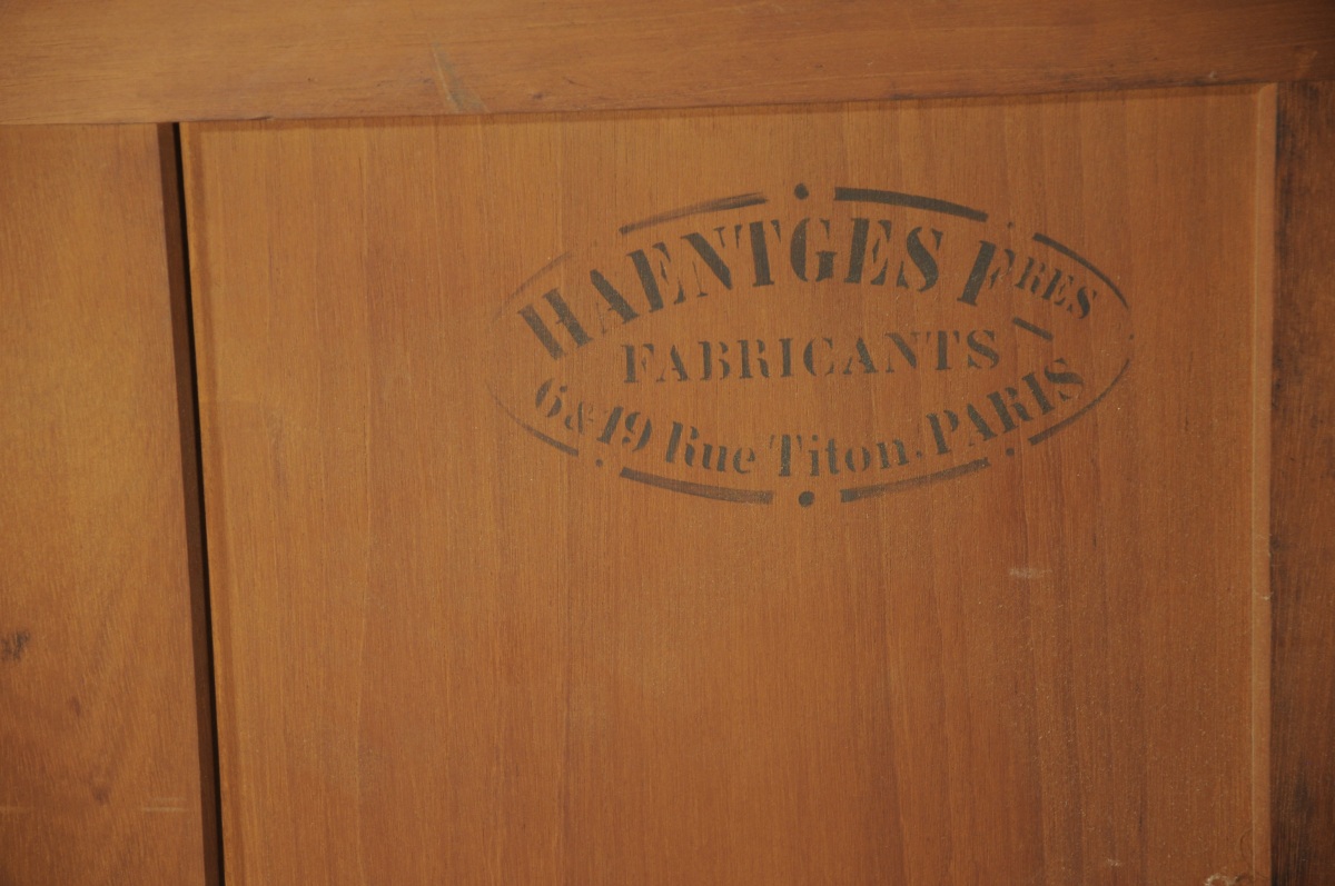 Le tiroir central et le tiroir de droite estampillés "HAENTGES Fres". L'intérieur du vantail de droite présente la plaque du fabricant marquée "Ébénisterie - Bronzes / HAENTGÉS FRÈRES / Fabricants / 6, Rue Titon, Paris". Tampon de Haentgés Frères au dos.