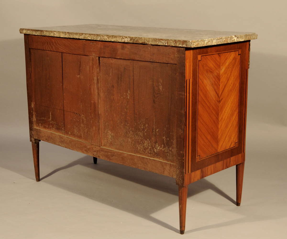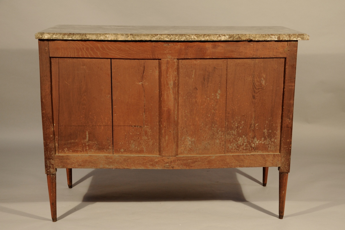 COMMODE à léger RESSAUT ouvrant à trois tiroirs en bois de placage à encadrements de bois clair. Montants en arrondi sur pieds fuselés à fausses cannelures. Garniture en bronze: anneaux, serrures et chutes. Dessus de marbre brèche.
