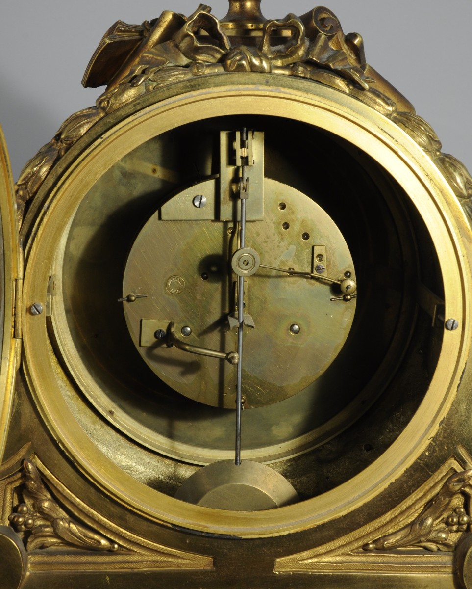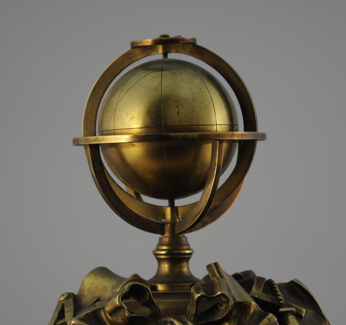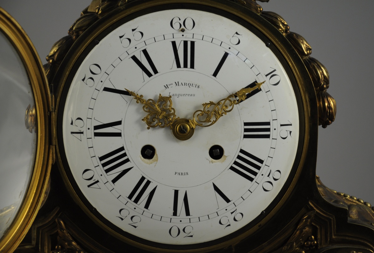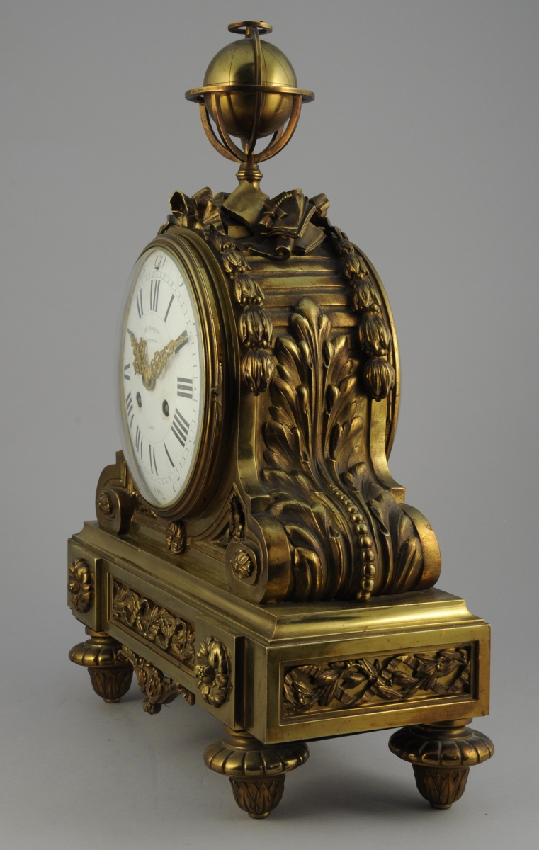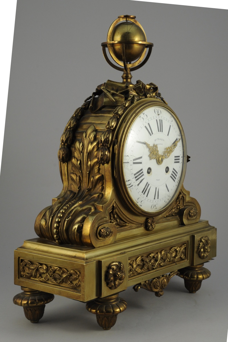 PENDULE À LA GÉOGRAPHIE en bronze ciselé et doré. Riche ornementation de guirlandes feuillagées rubanées, feuilles d'acanthe stylisées et fleurons. Elle est sommée d'un globe terrestre flanqué au pied d'attributs cartographiques. Socle quadrangulaire adhérent reposant sur quatre pieds toupie agrémenté de godrons et feuilles d'eau. Le cadran émaillé blanc indique les heures en chiffres romains et les minutes en chiffres arabes. Il est signé " Mson Marquis / Languereau / Paris ". Le mouvement marqué " Languereau / Paris ". Deux aiguilles en bronze finement ciselées à décor ajouré de rinceaux feuillagés agrémentés, pour la plus grande, d'un dauphin.