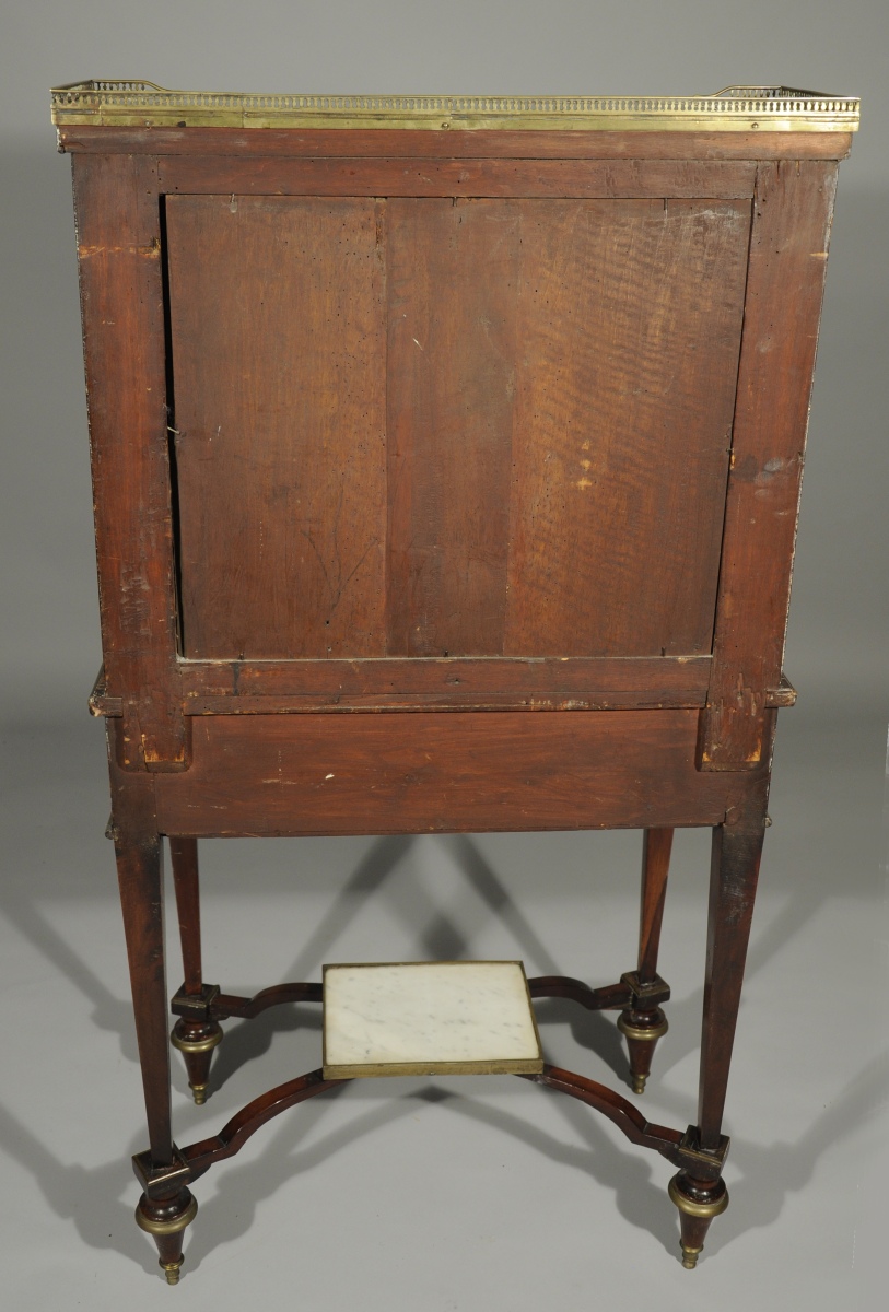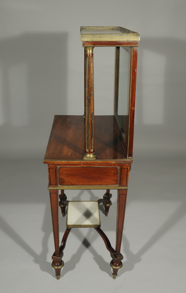 BONHEUR DU JOUR à fond de glace en acajou et placage d'acajou. Il ouvre en façade par un tiroir en ceinture découvrant une écritoire. Dessus de marbre blanc serti d'une galerie de bronze ajouré soutenu par deux colonnes à cannelures garnies de laiton. Repose sur quatre pieds gaine terminés par une toupie et réunis par une entretoise en X centrée d'une tablette foncée de marbre blanc.