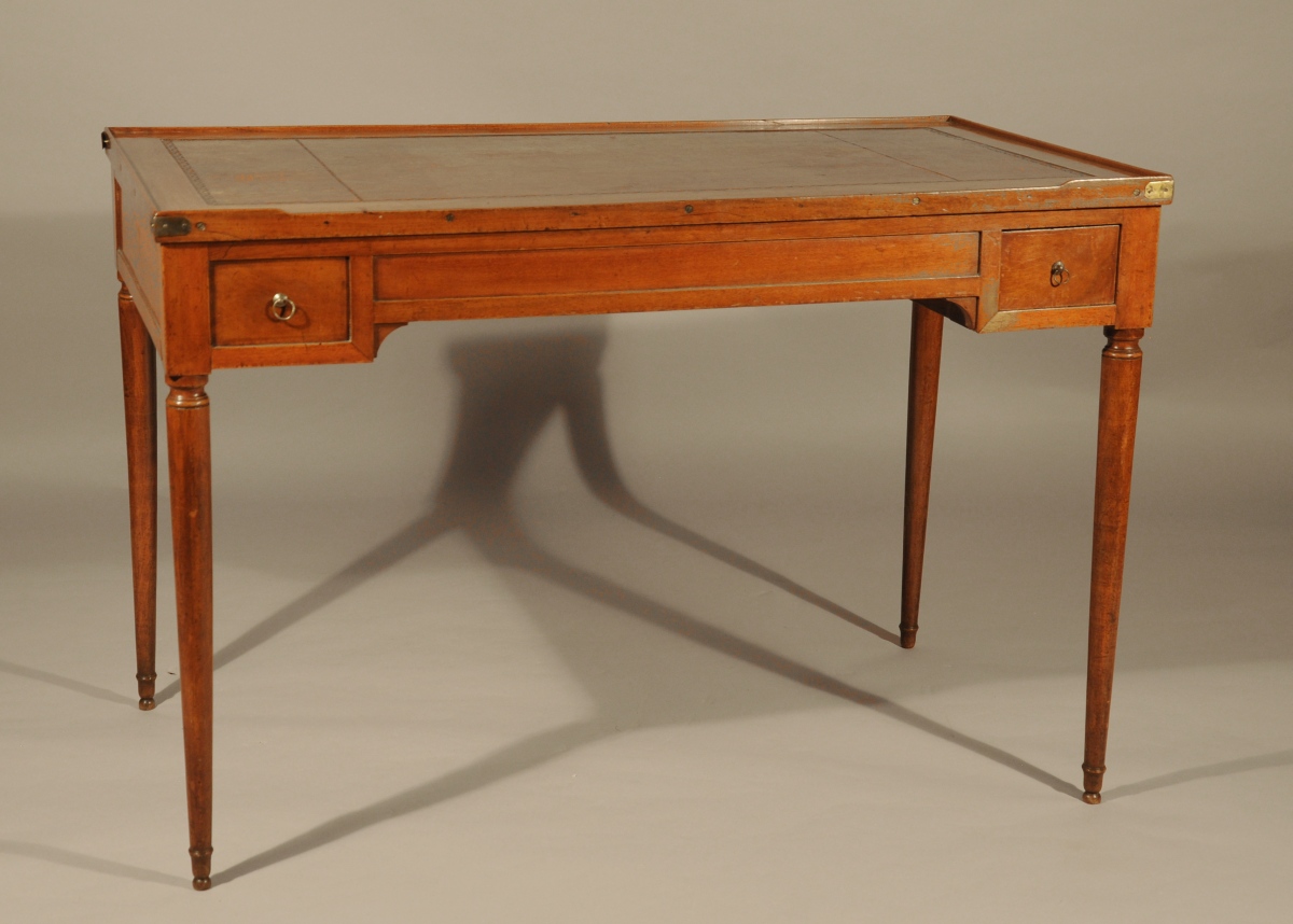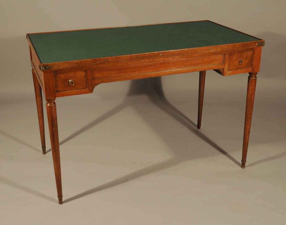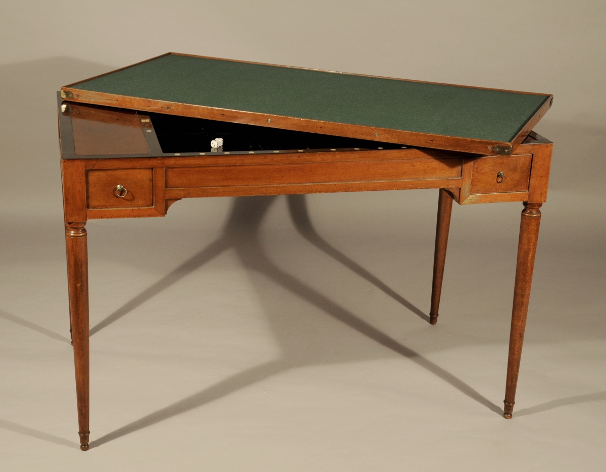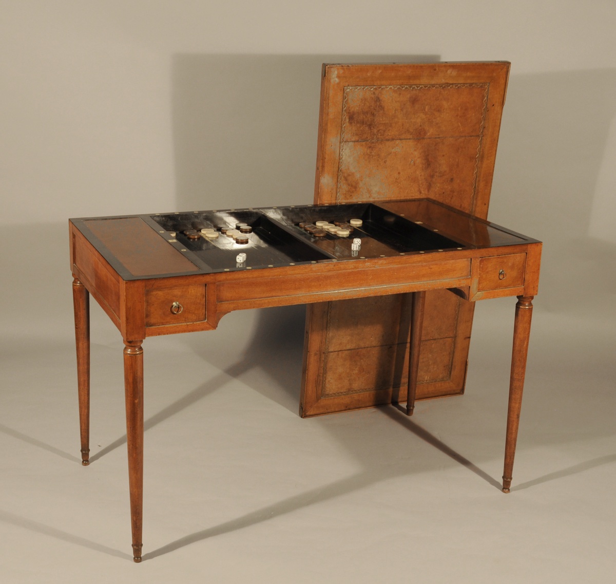 TABLE TRIC-TRAC formant bureau, en acajou et placage. Le plateau amovible foncé d'un maroquin découvrant un intérieur plaqué d'ébène, ivoire et os teinté vert. Il repose sur quatre pieds fuselés.