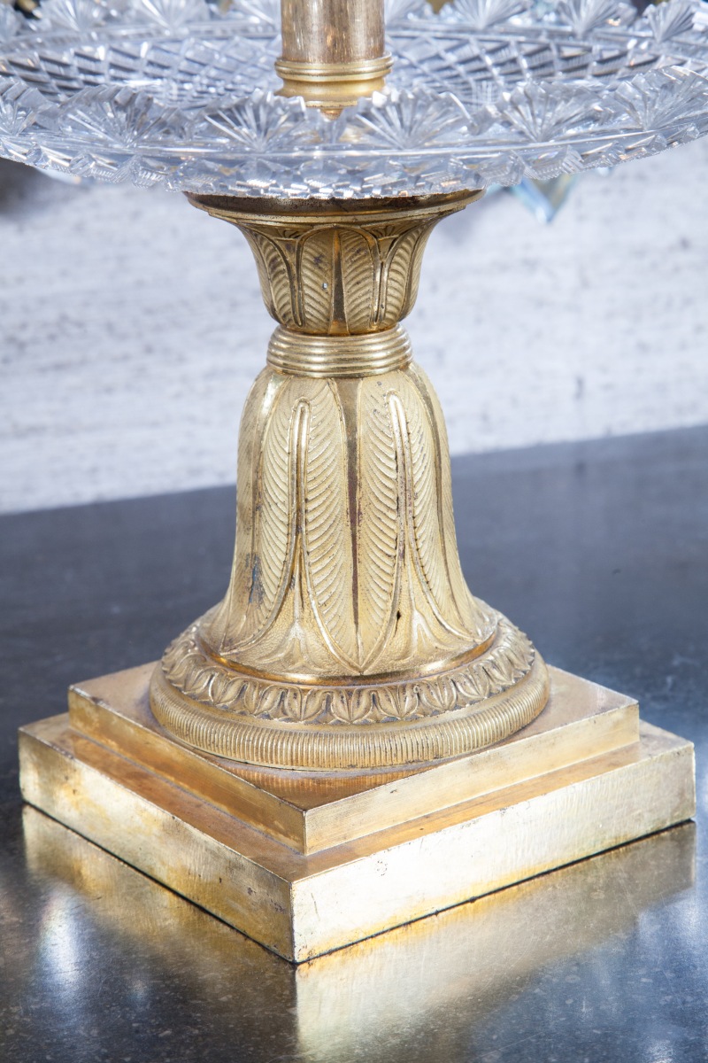 PAIRE de PRÉSENTOIRS en bronze doré à trois coupes (manque une) en cristal taillé à pointes de diamant. Pieds ornés de feuilles de lotus et rais de cur. Prises en anneau.