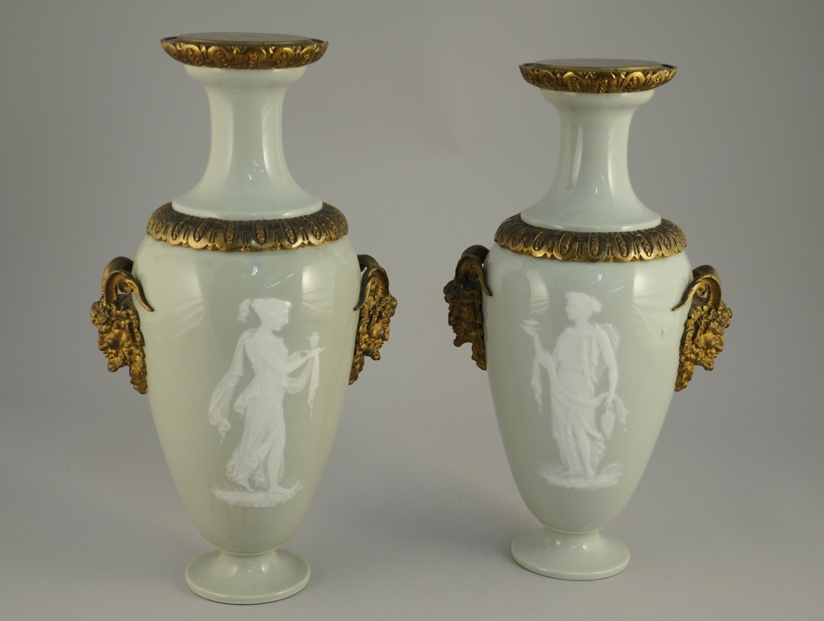 DEUX VASES balustre simulés formant paire en porcelaine à décor blanc en léger relief de vestales et de bouquets floraux su fond vert céladon. Monture de bronzes dorés tels que frises d'oves et dards à asperges sur le col et à l'épaulement, et anses en tête de faune.