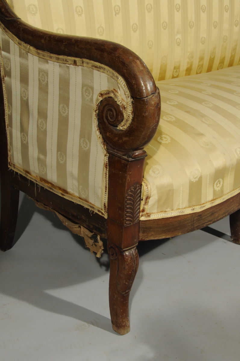 CANAPÉ à crosses trois places en acajou et placage d'acajou sculpté. Le dossier renversé. Montants antérieurs sculptés d'une palmette. Il repose sur quatre pieds antérieurs en jarrets et deux pieds postérieurs sabres.