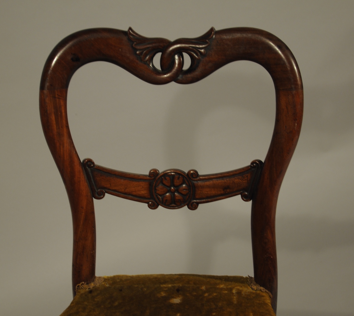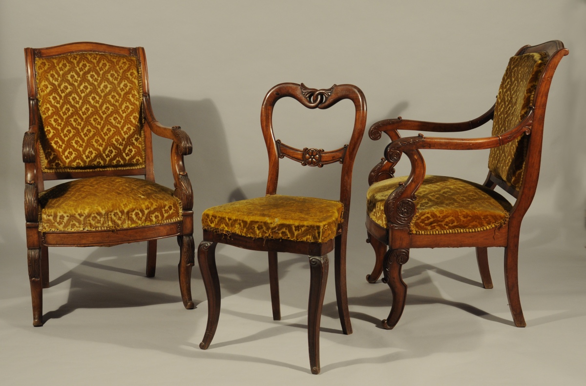 CHAISE en noyer mouluré et sculpté. Le dossier ajouré de tiges feuillagées enlacées. Traverse médiane centrée d'un fleuron. Pieds antérieurs à enroulements, pieds postérieurs en sabre.