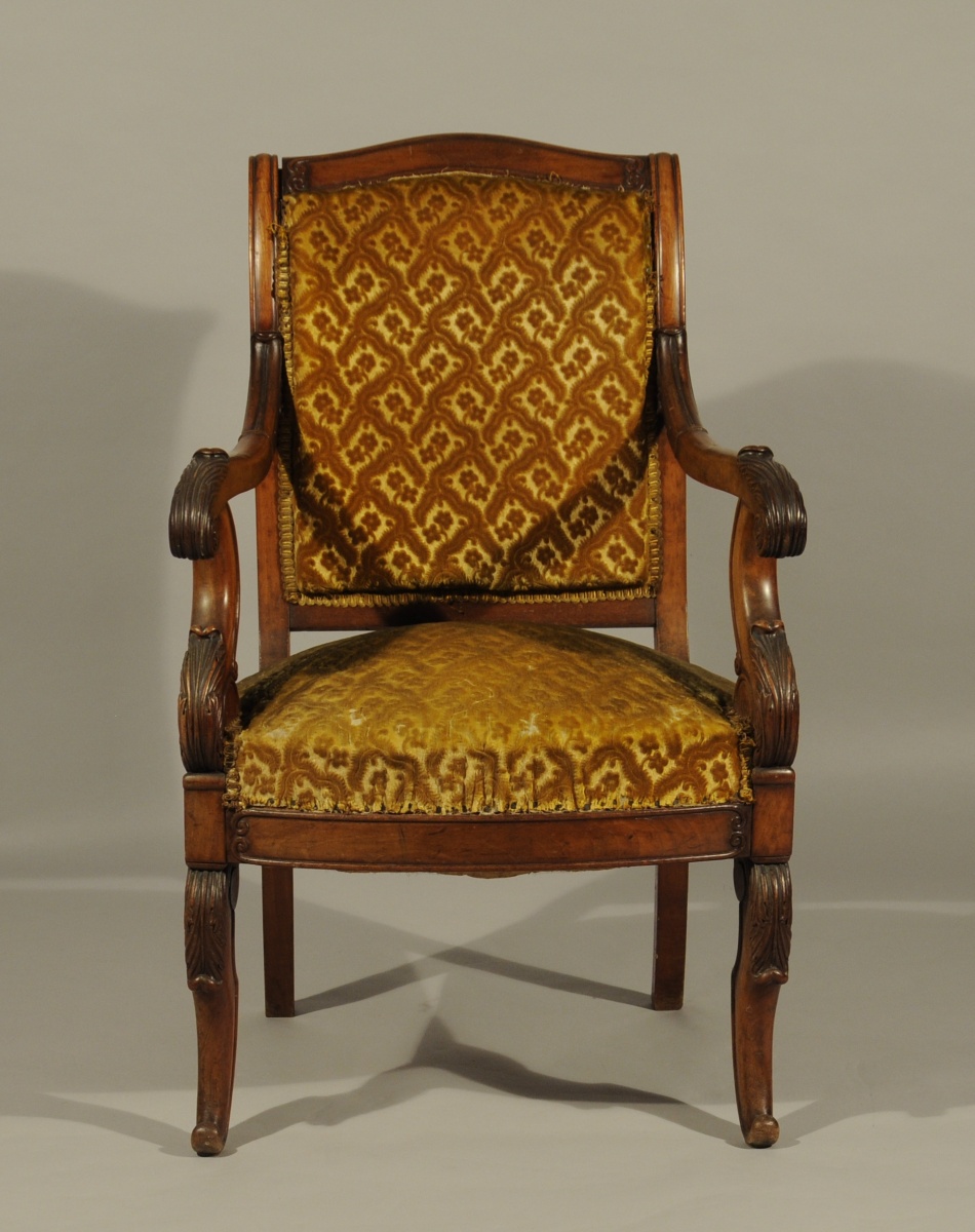 Paire de FAUTEUILS en acajou mouluré et sculpté. Accotoirs en crosse et supports d'accotoirs à enroulement fleuronné agrémentés de feuilles d'acanthe. Pieds antérieurs en jarret et pieds postérieurs en sabre.