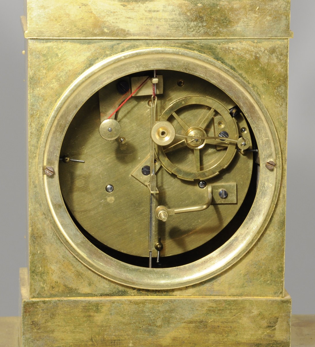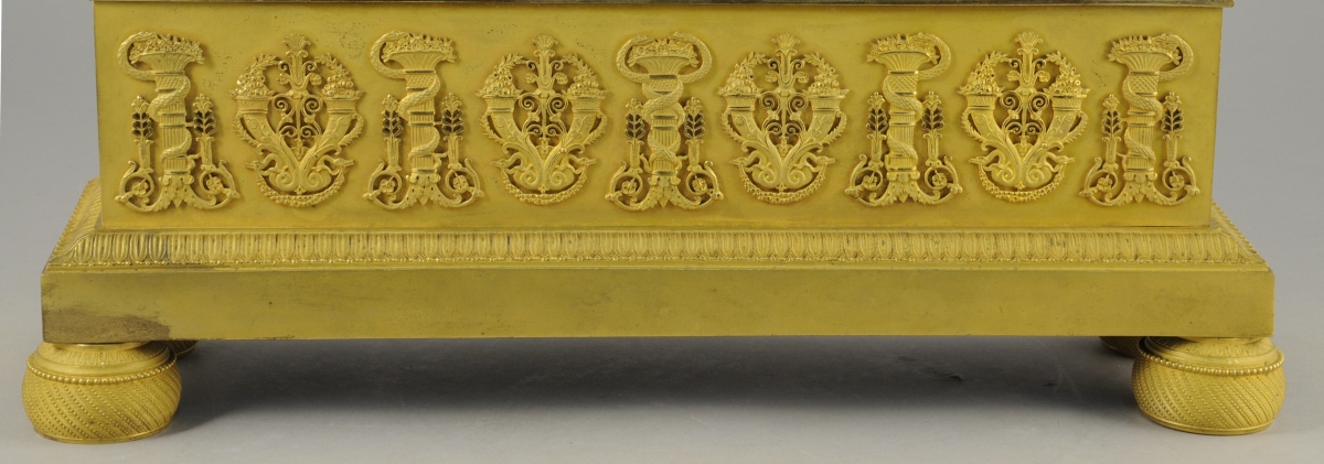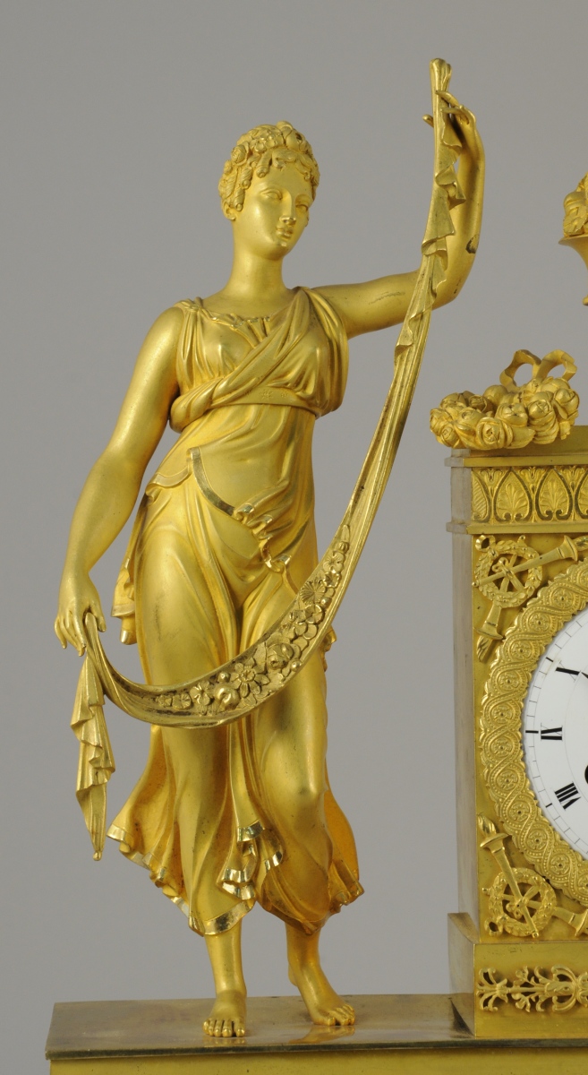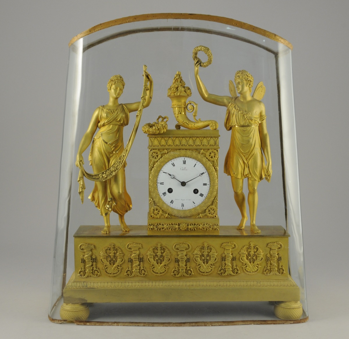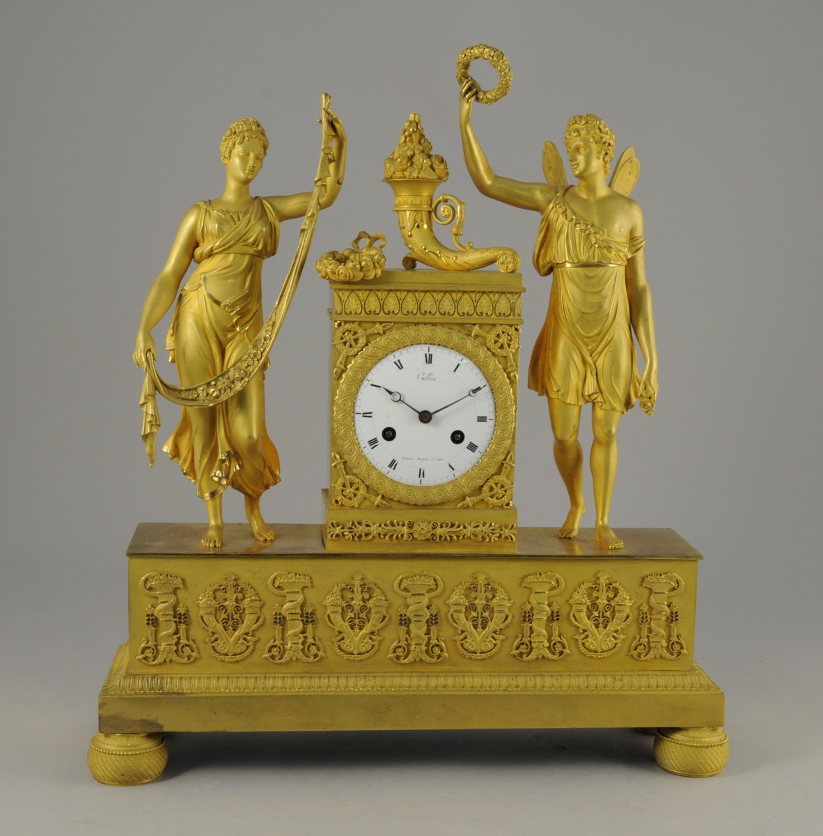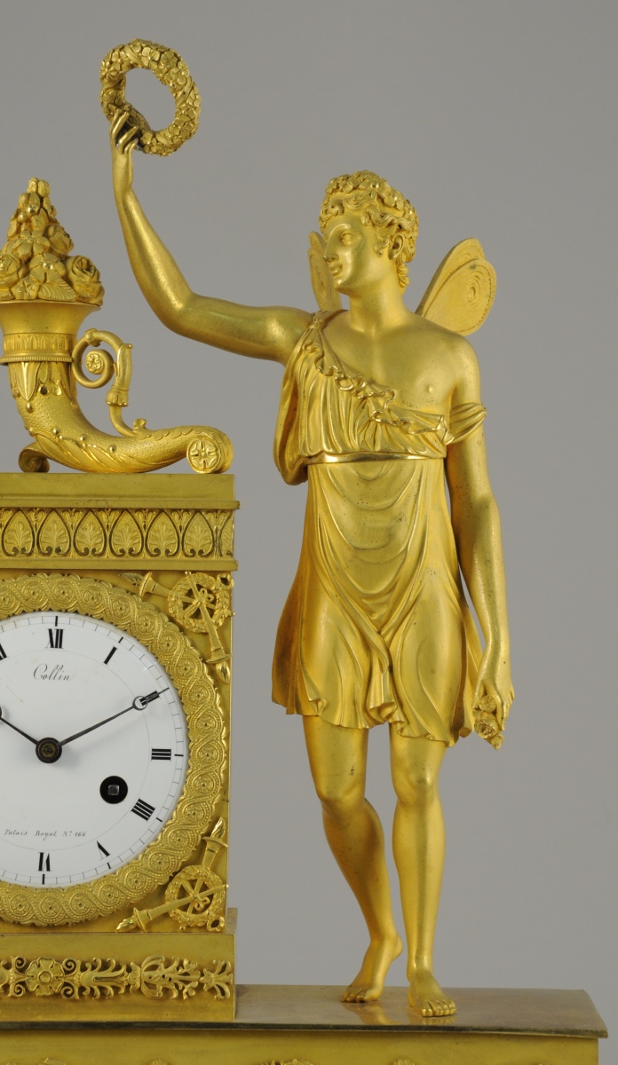 PENDULE à sujet en bronze ciselé et doré, bruni et amati, figurant, de part et d'autre d'une borne sommée d'une corne d'abondance, Psyché, tenant un drapé fleuri et Cupidon, brandissant une couronne de fleurs. Le cadran émaillé blanc indiquant les heures en chiffres romains inscrit dans la borne ornée de frises de palmettes, d'entrelacs fleuronnés et trophées de flambeaux inscrits dans une couronne de lauriers. Base de forme rectangulaire soulignée d'une frise de feuilles d'eau à décor d'ornements appliqués figurant cornes d'abondances, rinceaux, cols de cygne et guirlandes en alternance avec des paniers fleuris sur lesquels s'enroulent deux serpents. Elle repose sur quatre pieds en boule aplatie ornés de guillochis. Le cadran signé "Collin / Palais Royal N°166". Mouvement à fil.