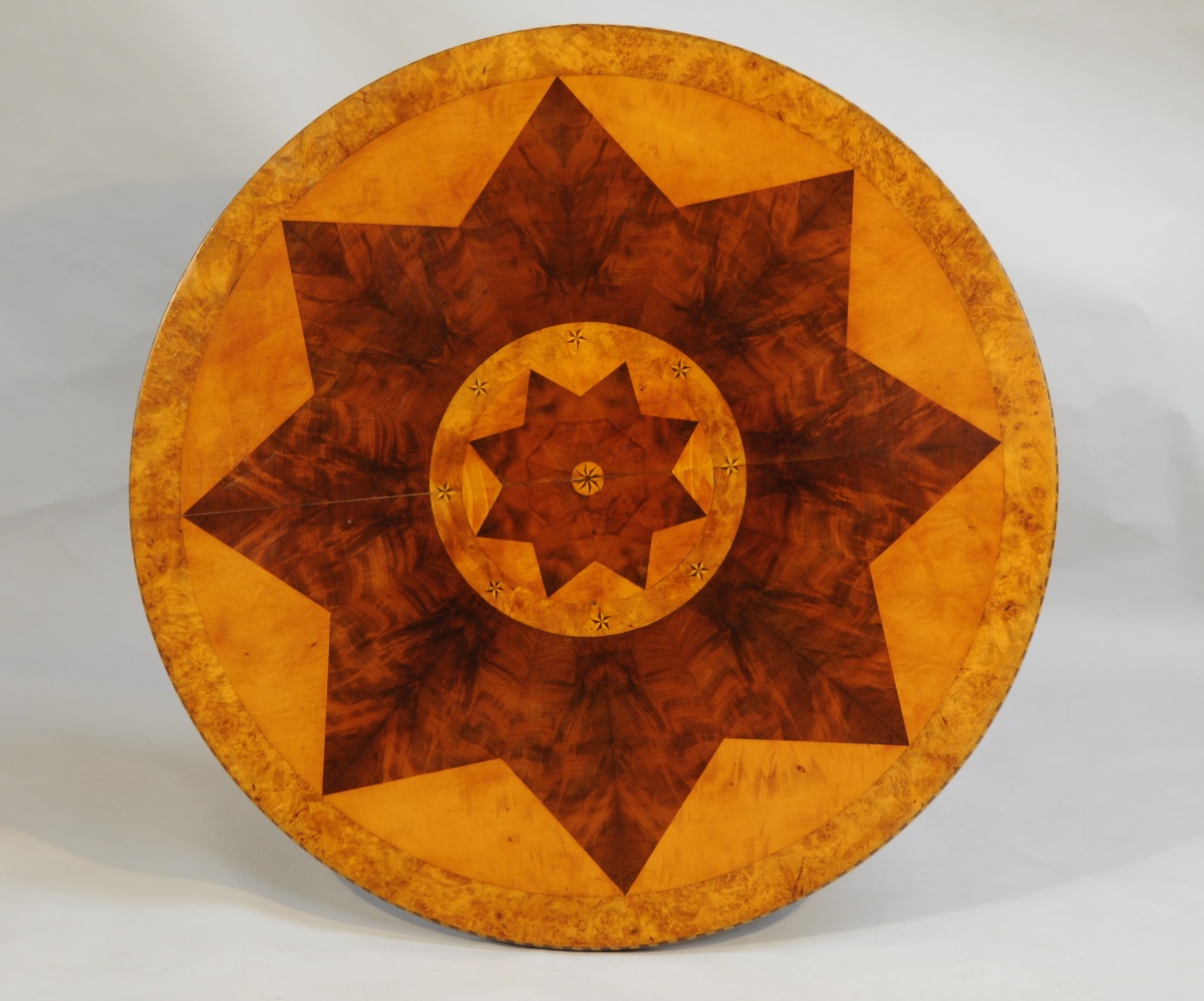 GUÉRIDON en bois de placage d'acajou, de ronce, de loupe, de frêne et citronnier. Piètement balustre reposant sur trois consoles renversées ; riche plateau circulaire en marqueterie à double étoile à huit branches. Ceinture marquetée d'acajou et de bois clair.