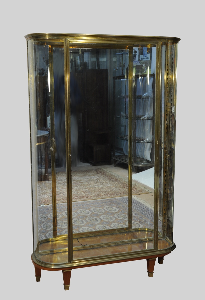 VITRINE de forme rectangulaire à armature en laiton à 5 étagères en verre. Les parois latérales bombées. Fond miroir. Sur un piètement à quatre pieds gaine en placage de bois clair.