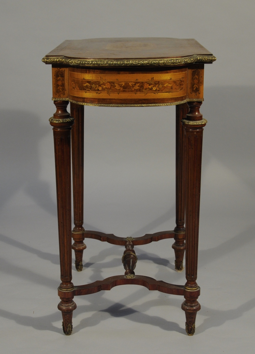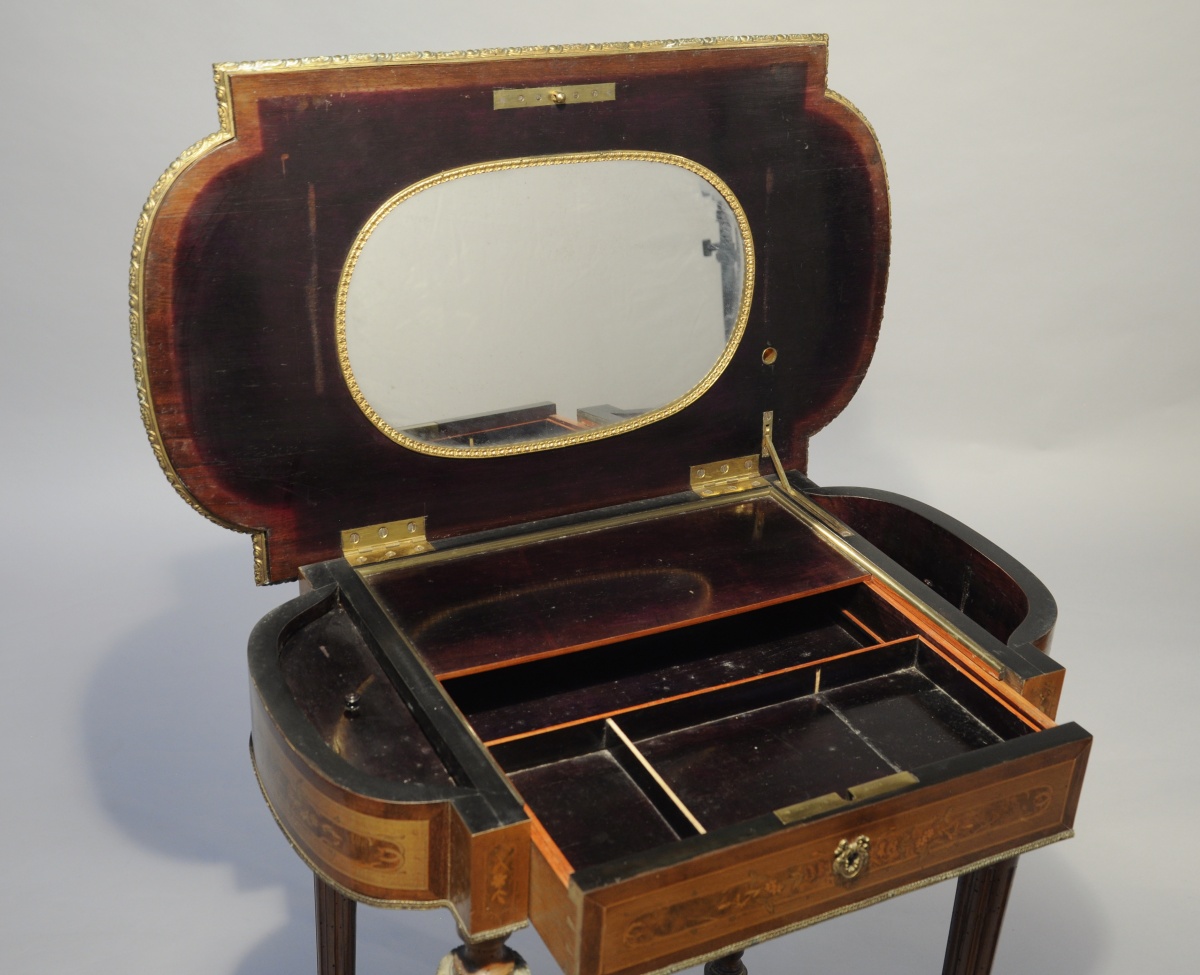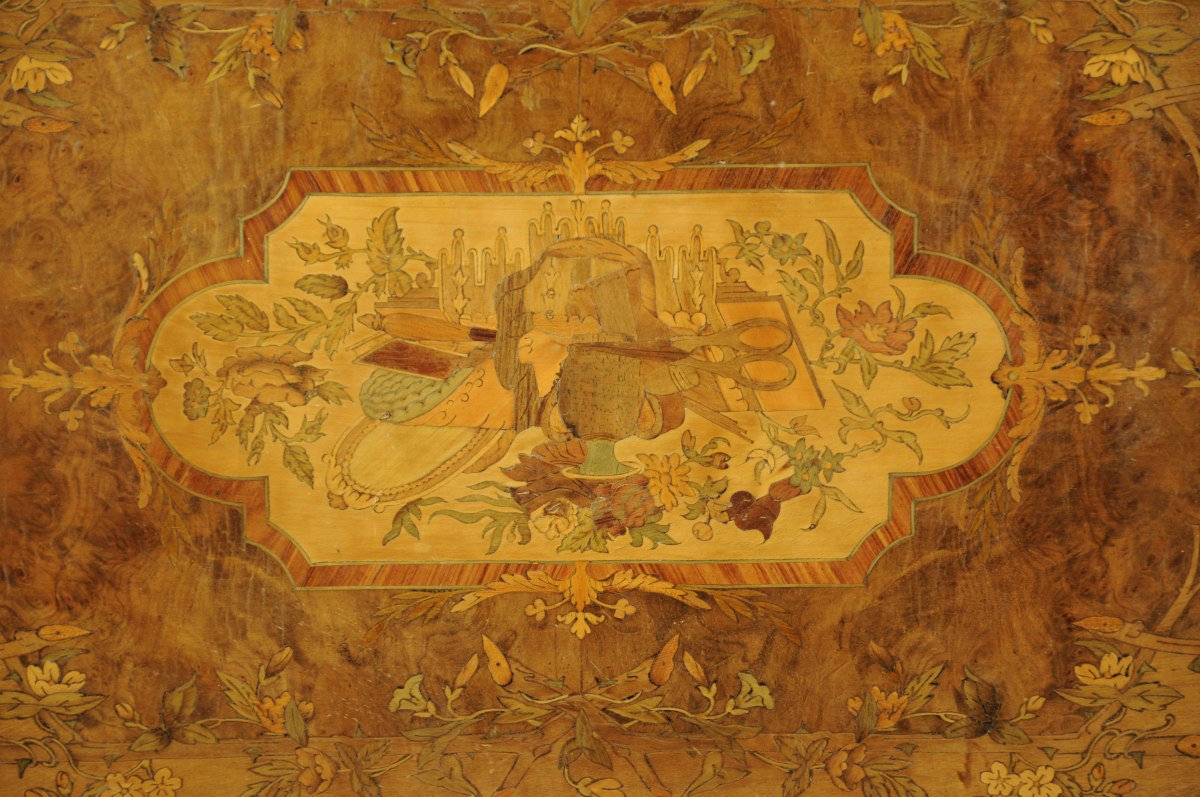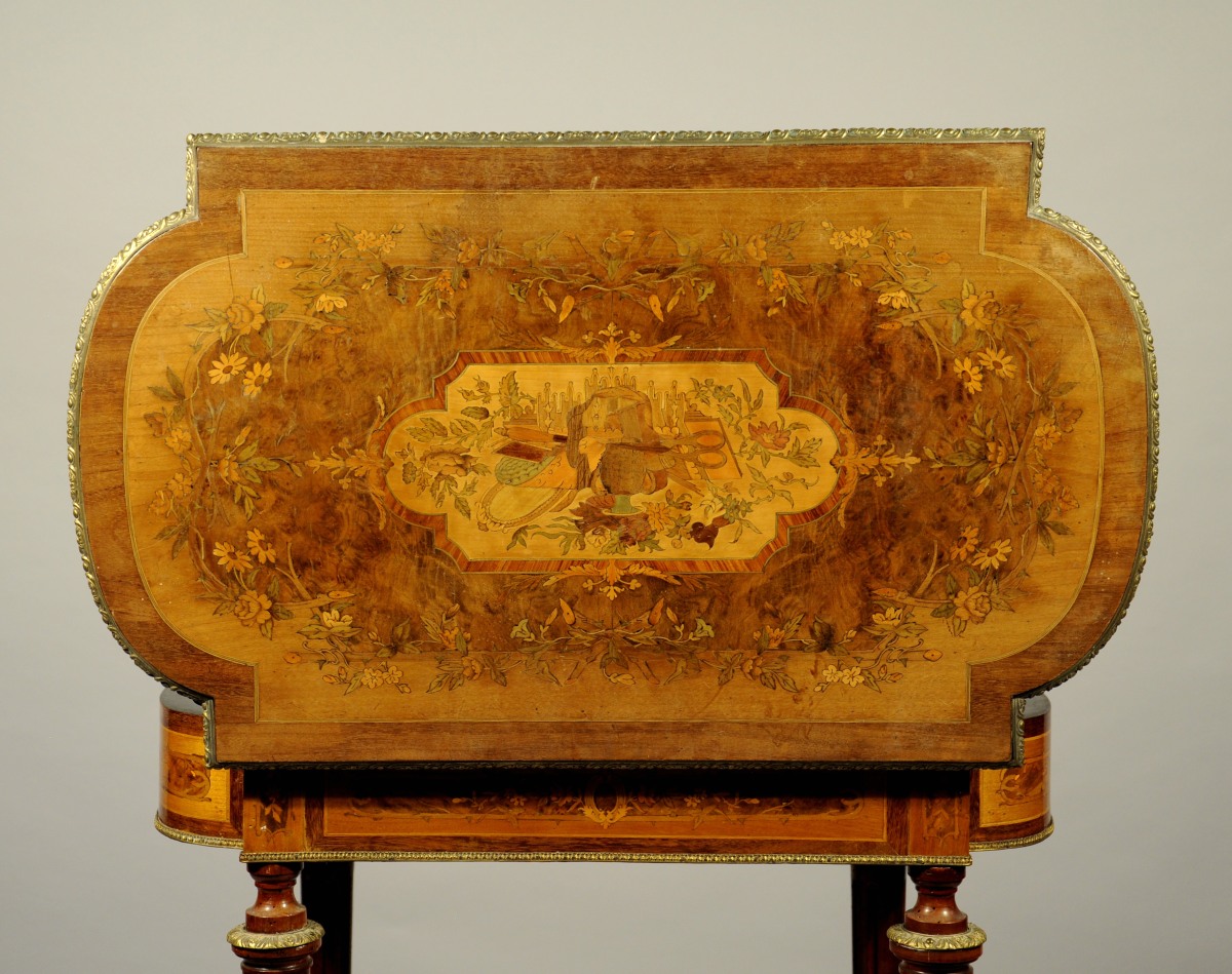TABLE À OUVRAGE en bois de placage et marqueterie de bois de couleurs et teintés, toutes faces. Plateau basculant orné dans des entrelacs floraux en son centre d'une composition allégorique - foncé d'une glace au teint à l'intérieur. Ouvre par un tiroir. Piètement à cannelures réuni par une entretoise. Ornementation en bronzes: lingotière, bagues.