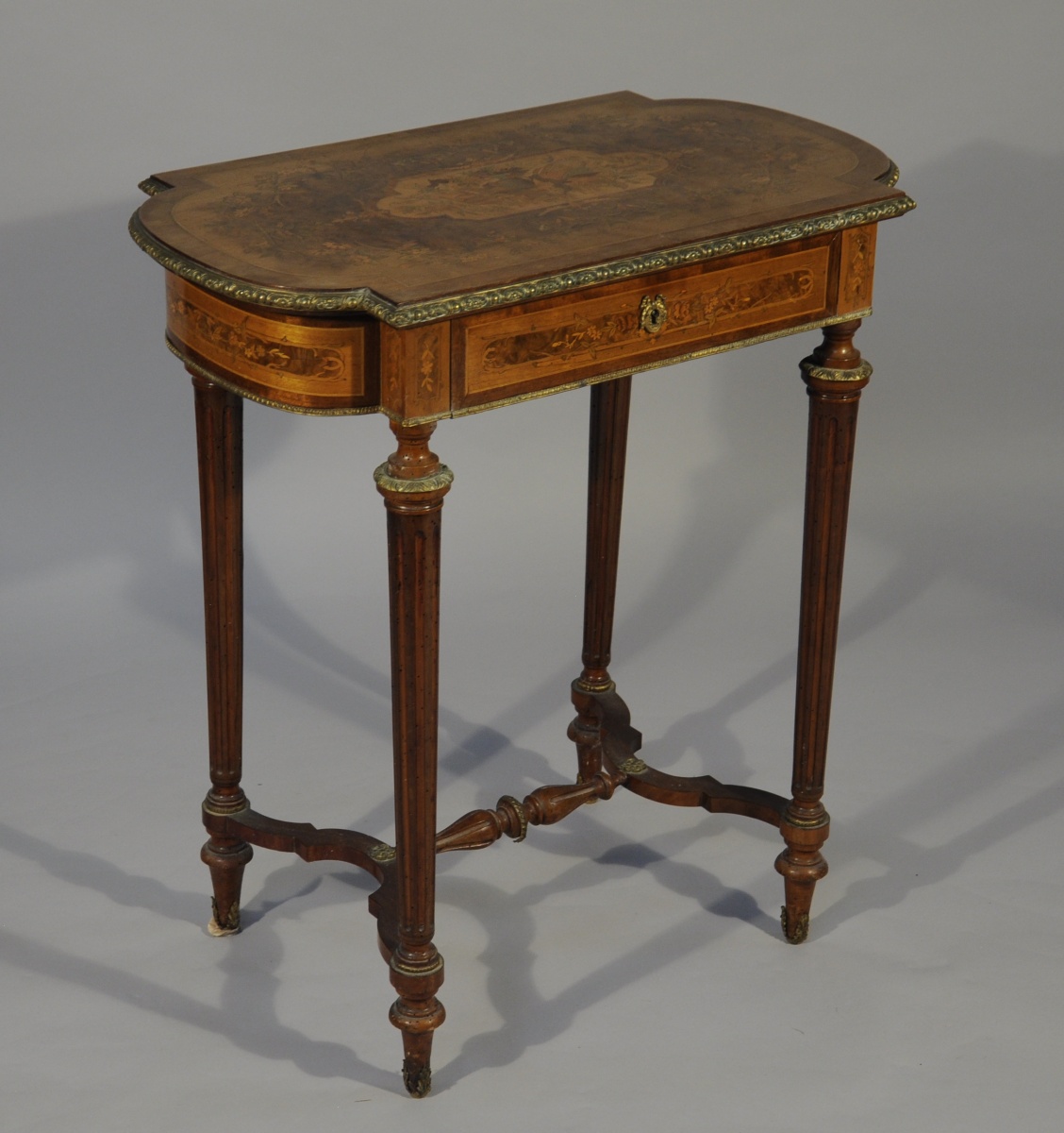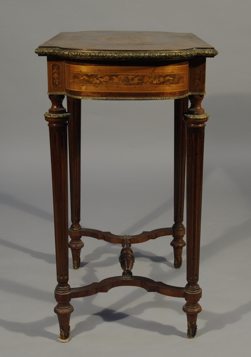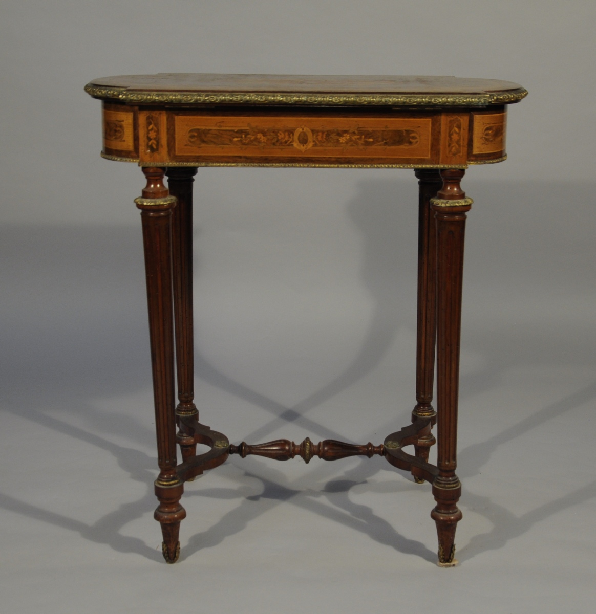 TABLE À OUVRAGE en bois de placage et marqueterie de bois de couleurs et teintés, toutes faces. Plateau basculant orné dans des entrelacs floraux en son centre d'une composition allégorique - foncé d'une glace au teint à l'intérieur. Ouvre par un tiroir. Piètement à cannelures réuni par une entretoise. Ornementation en bronzes: lingotière, bagues.