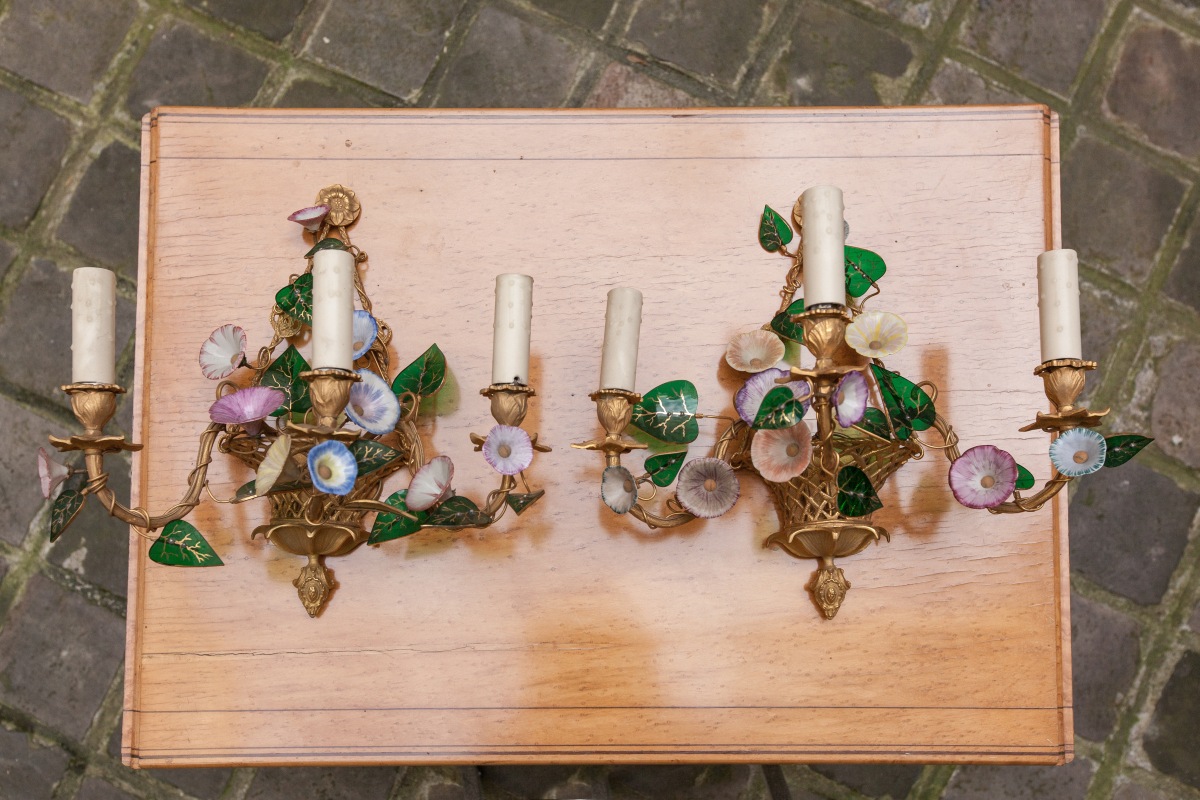 PAIRE d'APPLIQUES à trois lumières en bronze doré à décor de panier de vannerie et branches de liseron à fleurs de porcelaine et feuilles d'opaline verte.