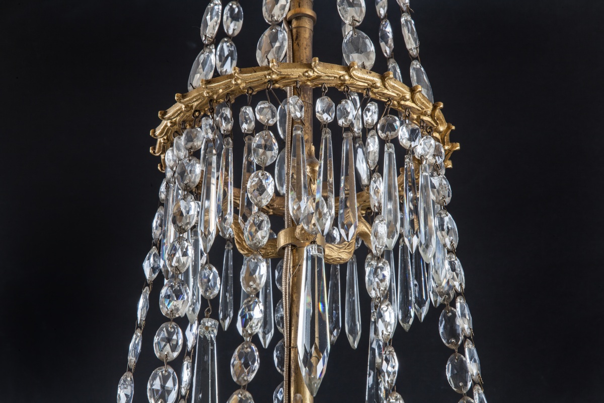 LUSTRE en bronze et laiton doré à neuf bras de lumière feuillagés et binets évasés ornés de palmettes. Fût central en forme de vase surmonté d'une couronne feuillagée. Ornementation d'olives et pampilles en cristal taillé.