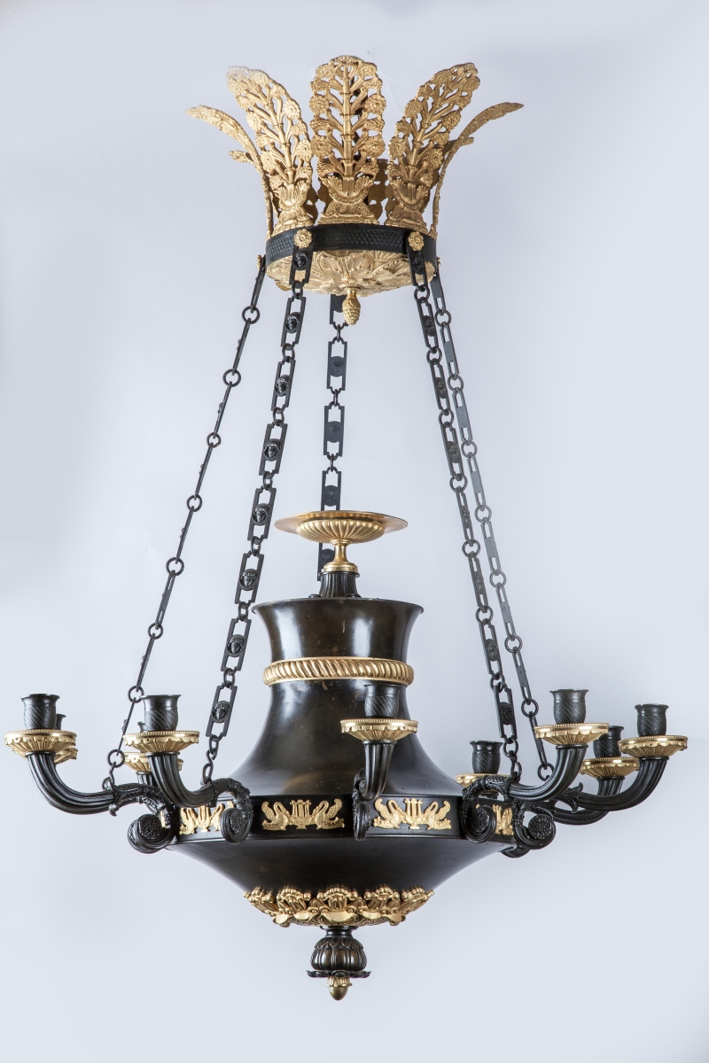LUSTRE en forme de lampe antique en bronze et tôle patinés et bronze doré à douze lumières. Riche décor doré de palmettes, cygnes, coupe et feuillage.