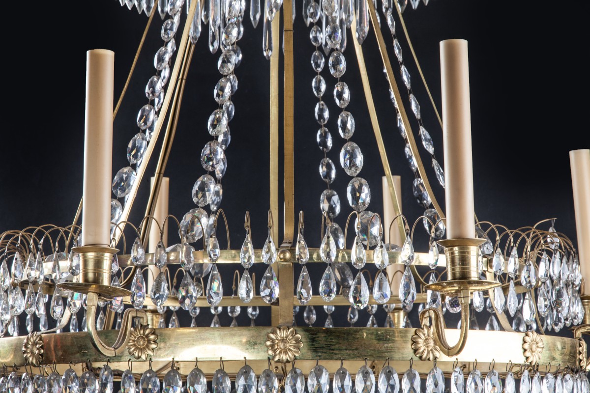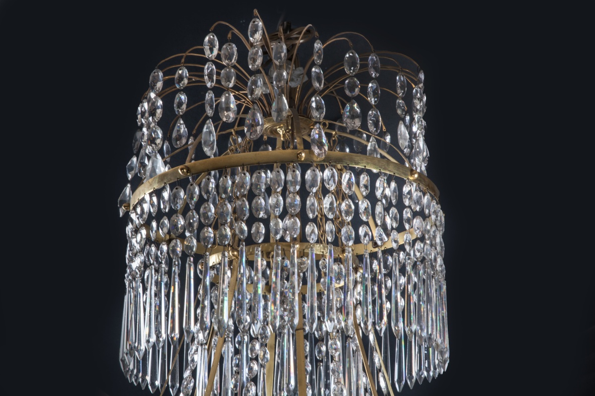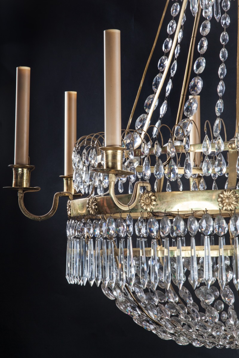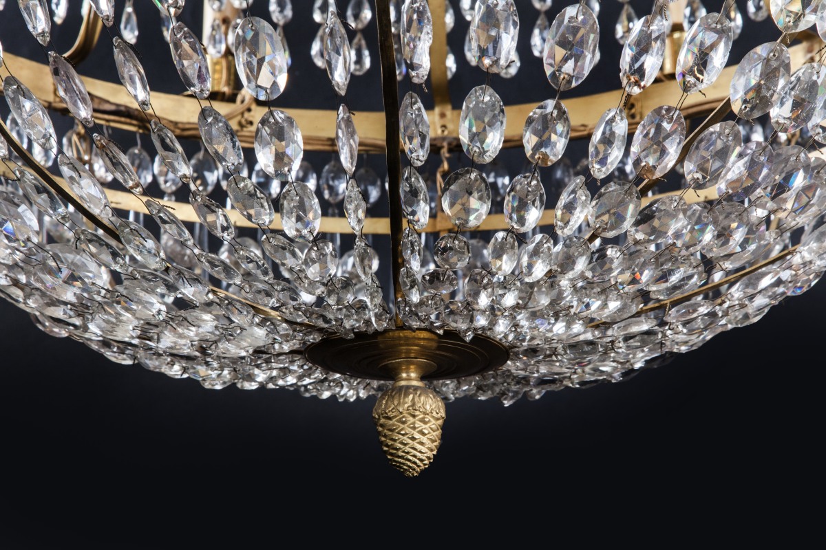 LUSTRE corbeille à couronne en bronze doré à huit bras de lumière orné d'olives et pampilles en cristal taillé.