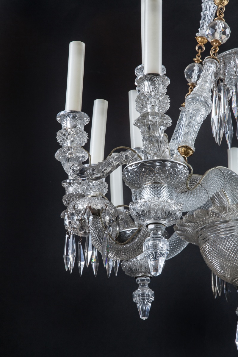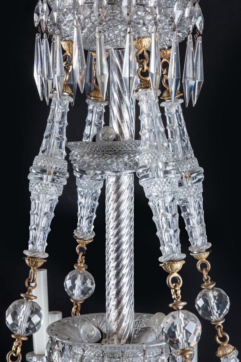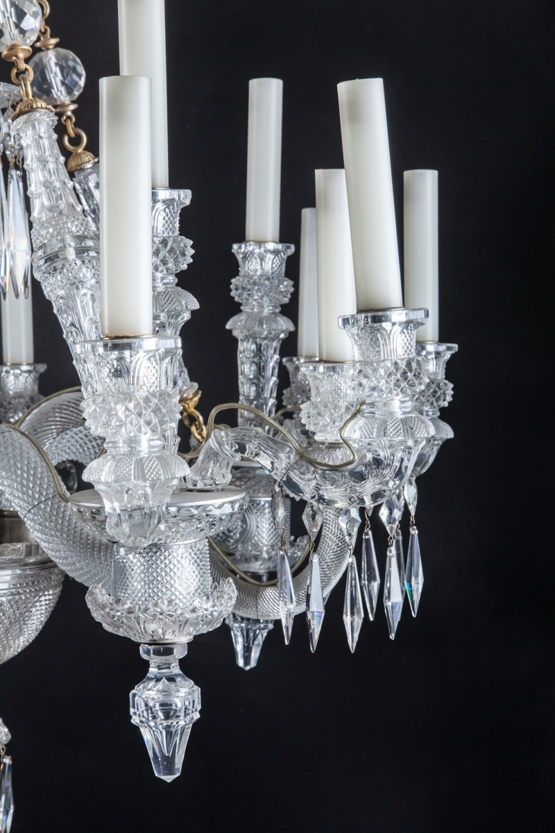 LUSTRE en cristal à pointes de diamant et pampilles, à coupe centrale à seize lumières en huit branches alternées à une et trois lumières.