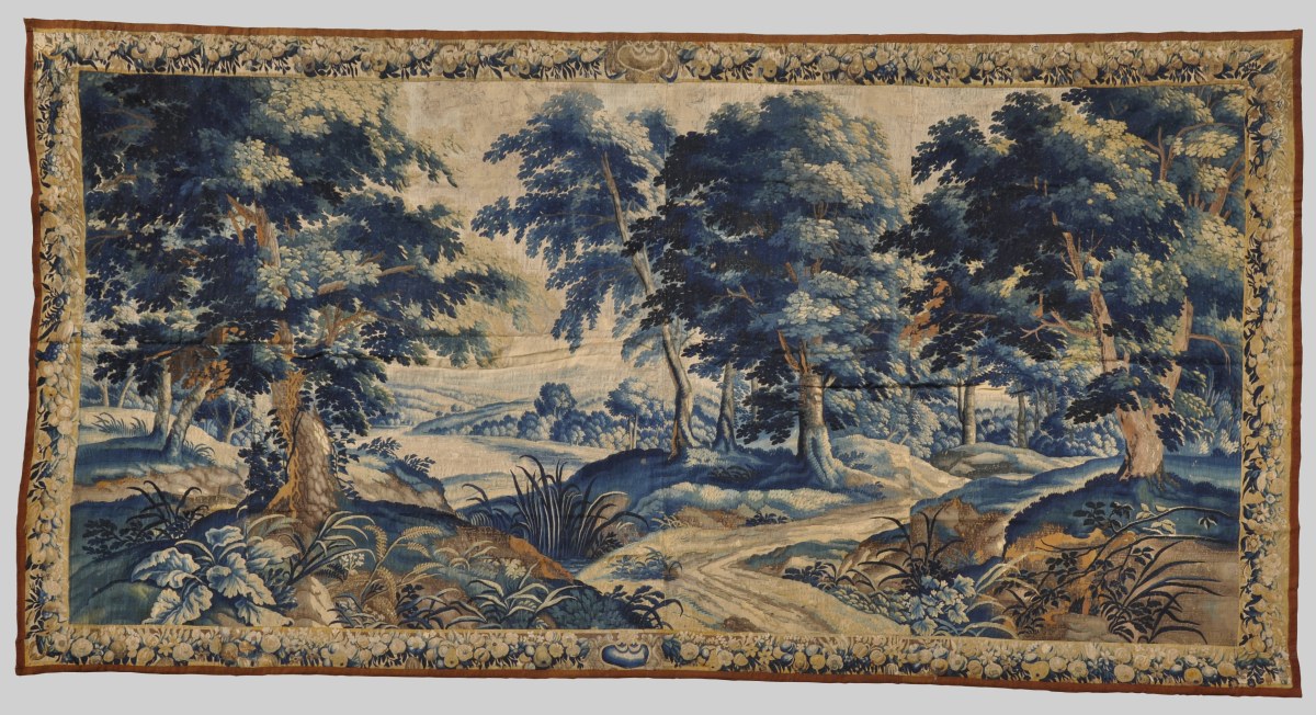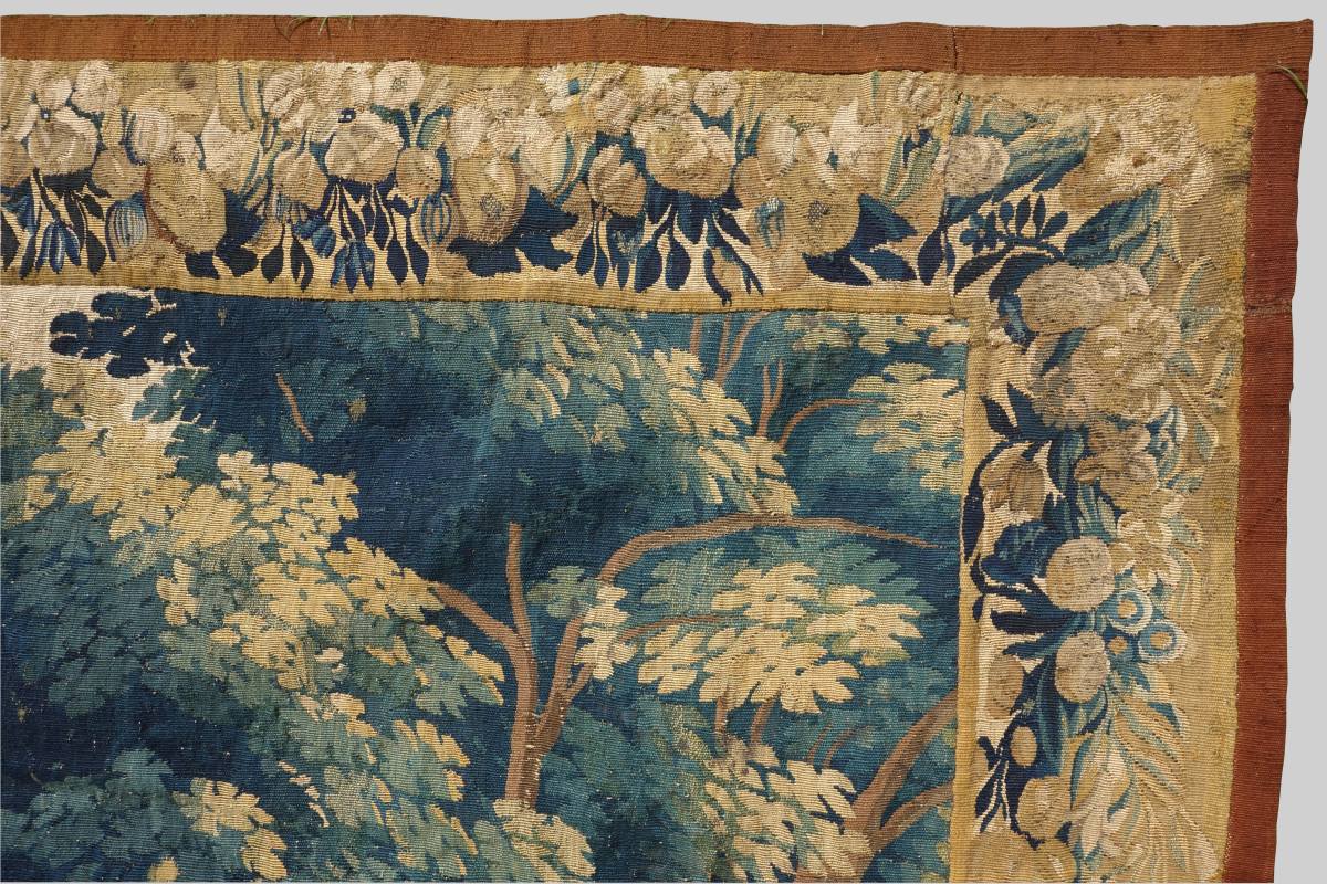 Tapisserie verdure en laine. Bordure à fleurs et à fruits.