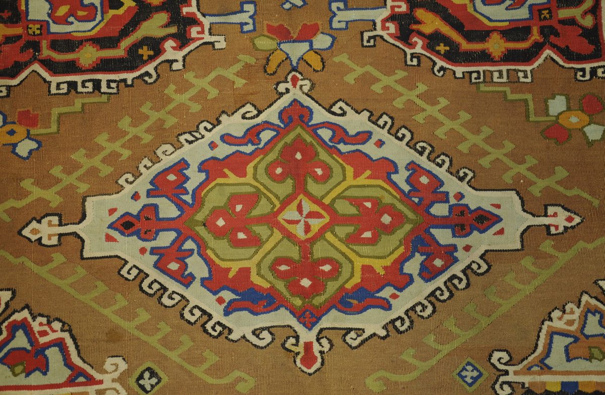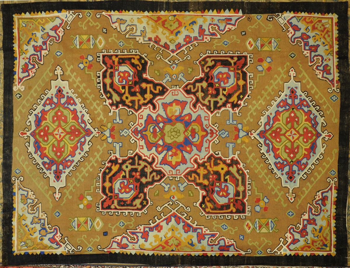 TAPISSERIE en laine, au point noué, à fond chocolat à décor polychrome de motifs géométriques et décor floral stylisé. Bordure noire.