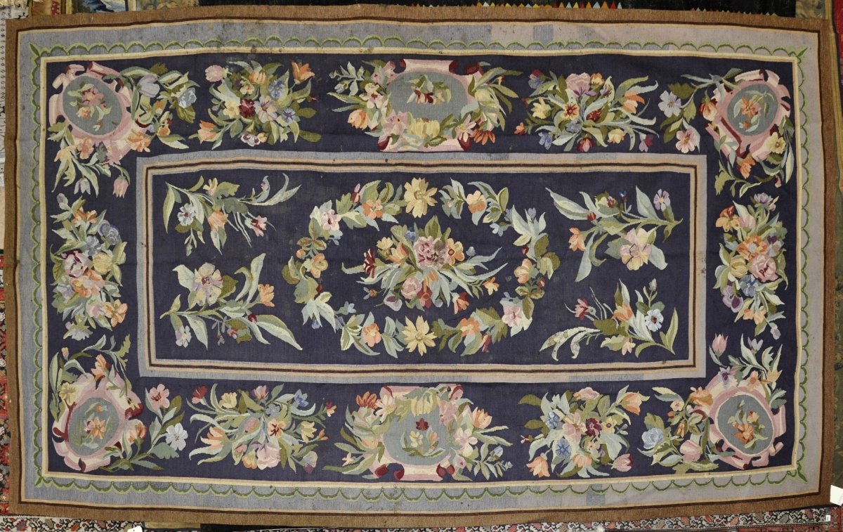 TAPIS en laine à fond bleu à décor de bouquets de fleurs au naturel. Six s'inscrivent dans des médaillons roses à l'imitation du cuir découpé.