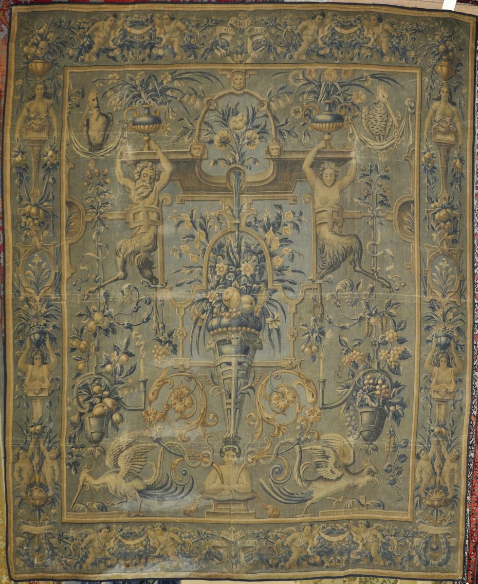 TAPISSERIE à décor imprimé de style renaissance tel que satyres, cariatides, vases fleuris, oiseaux fantastiques, putti, rinceaux et ferroneries.