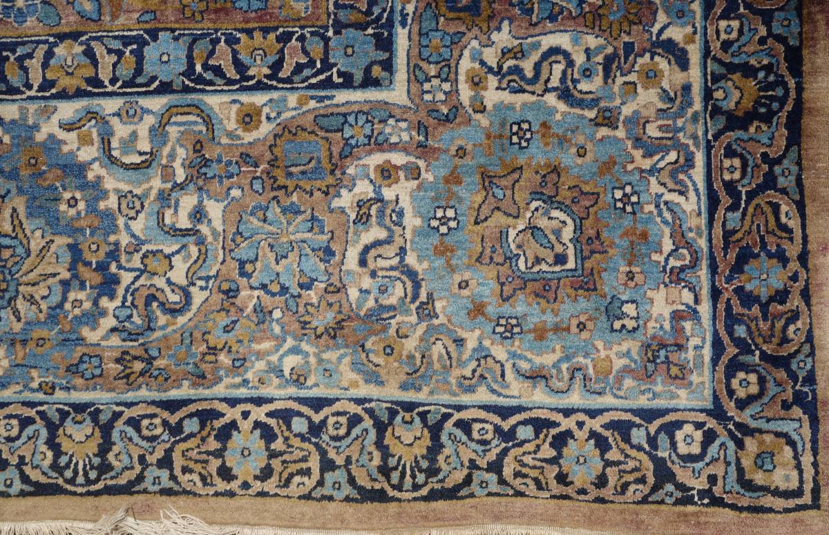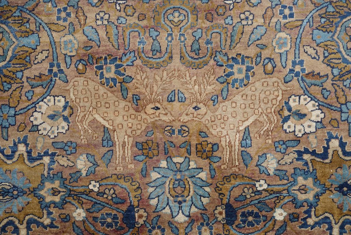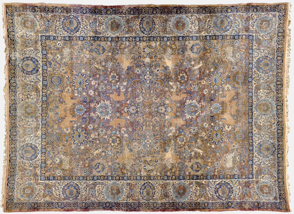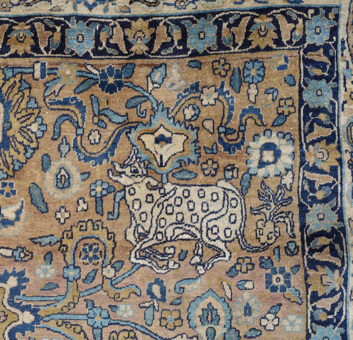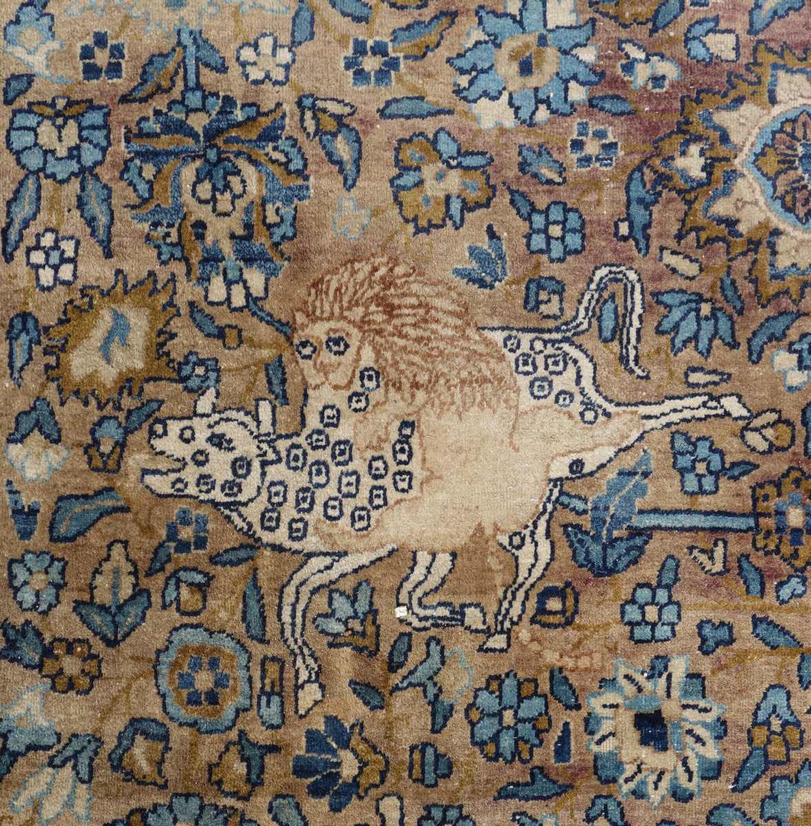 PERSE. TAPIS d'Orient à fond vieux rouge. Ornementation à dominante bleue de motifs floraux et animaliers figurant notamment des lions attaquant des buffles.