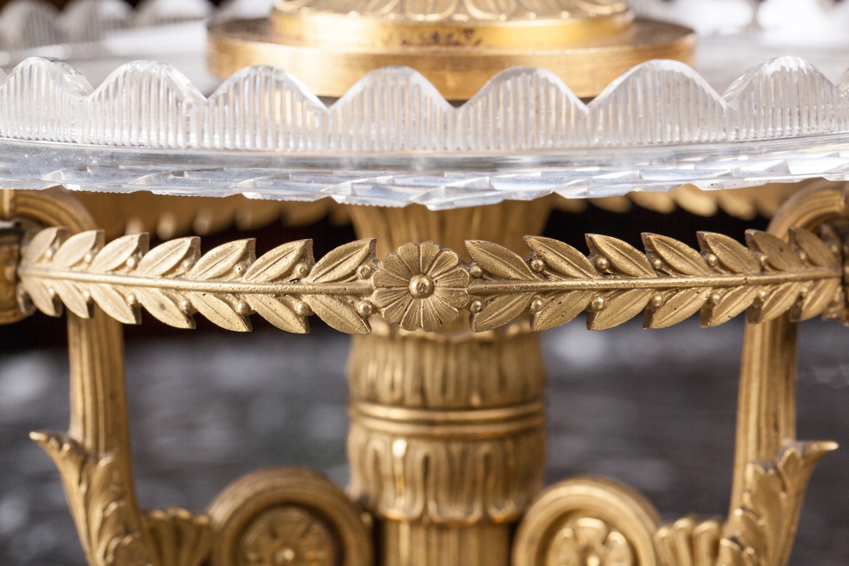 PAIRE de PRÉSENTOIRS en bronze doré à deux coupes en cristal taillé, ornés de feuilles lancéolées et rais de cur. Bases triangulaires échancrées à trois consoles inversées à enroulements.