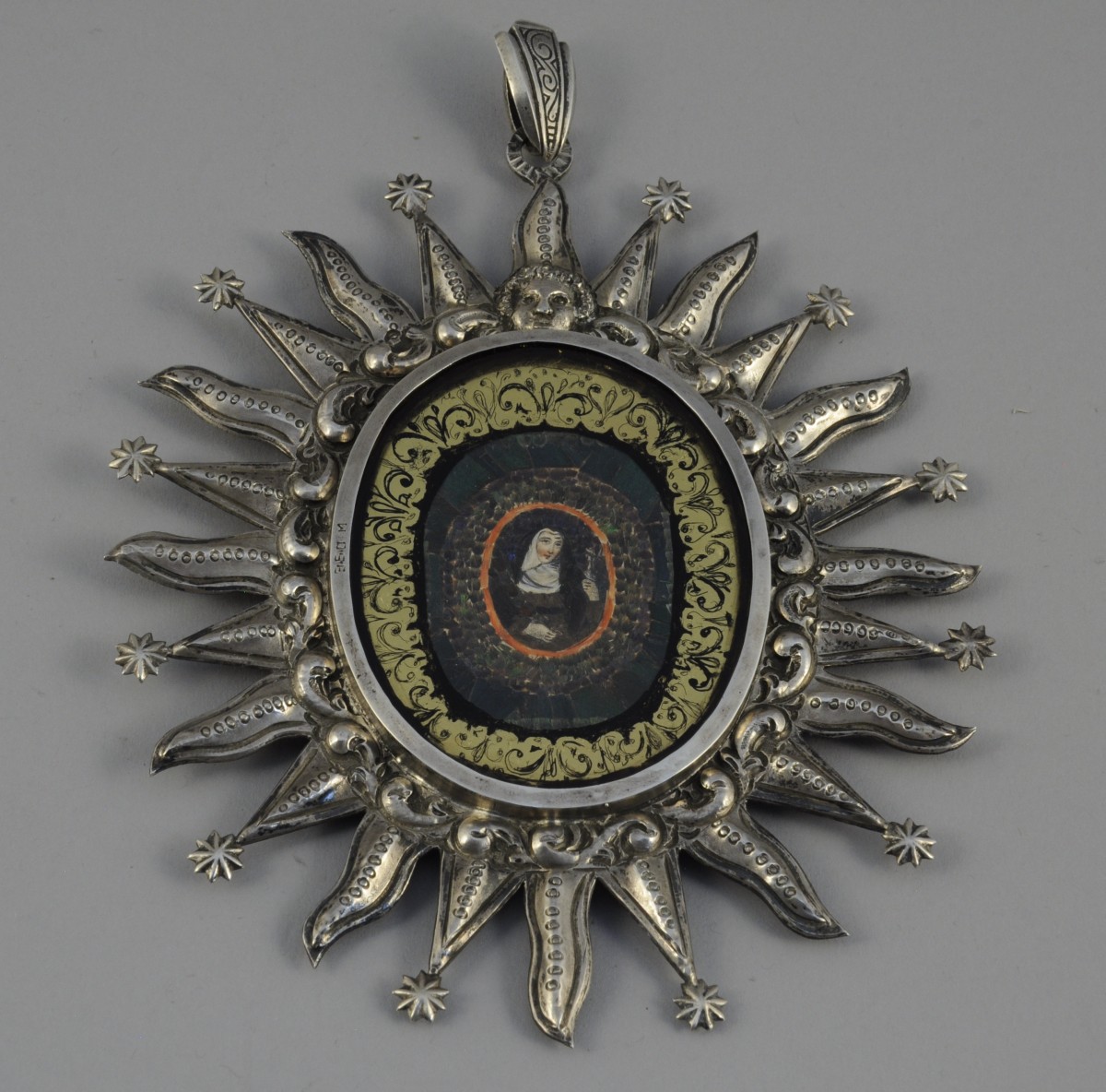 Le vêtement, un bouquet de roses, ainsi que trois niveaux successifs d'encadrements en marqueterie de plumes collées de couleur chatoyantes: vertes, bleues, noires, rouges, brunes et blanches. Le visage, les mains, la croix et une partie du voile de la Sainte dessinés. Le tout protégé par un verre de forme ovale au pourtour à décor églomisé noir et or de rinceaux, dans un encadrement enflammé en argent figurant les douze étoiles de la Vierge de l'Apocalypse et un ange.