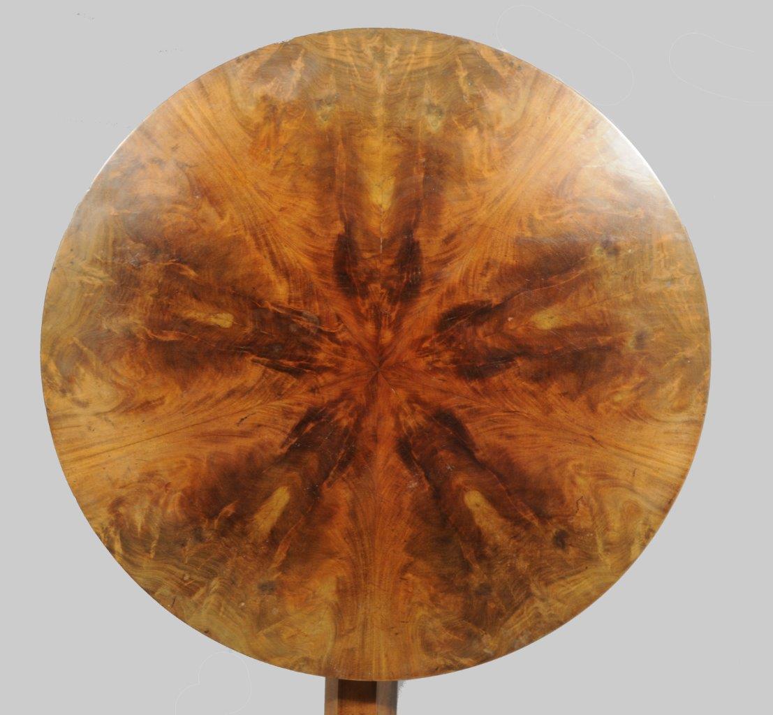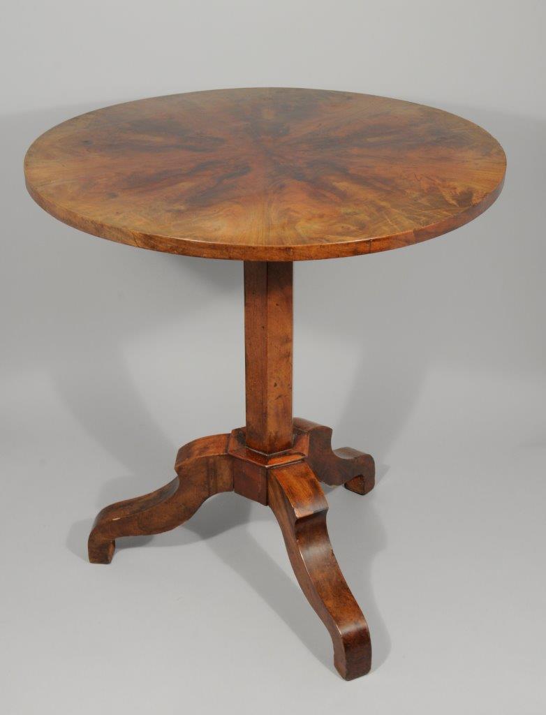 GUÉRIDON à plateau basculant de forme ronde en placage d'acajou flammé. Il repose sur trois pieds chantournés réunis à un fût hexagonal.