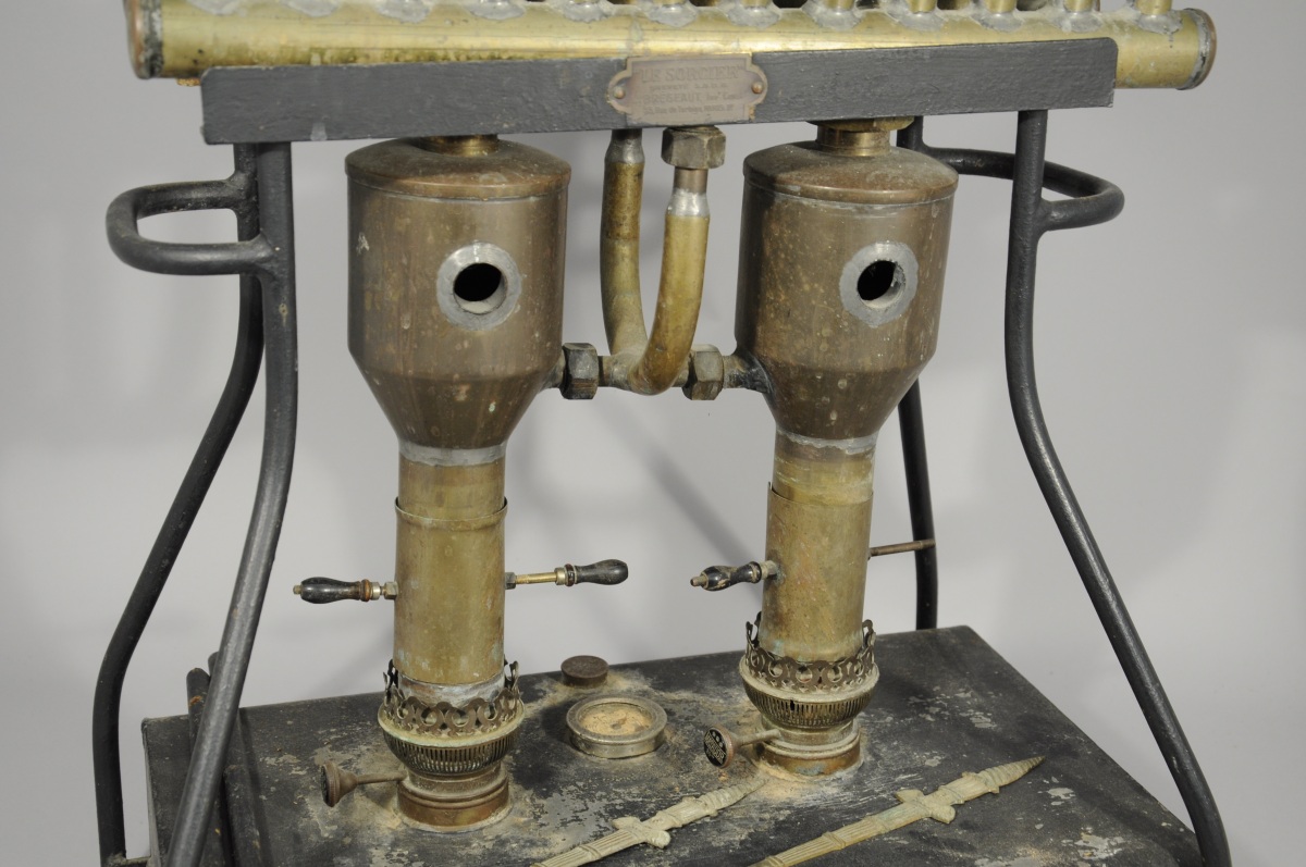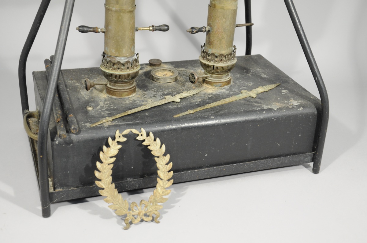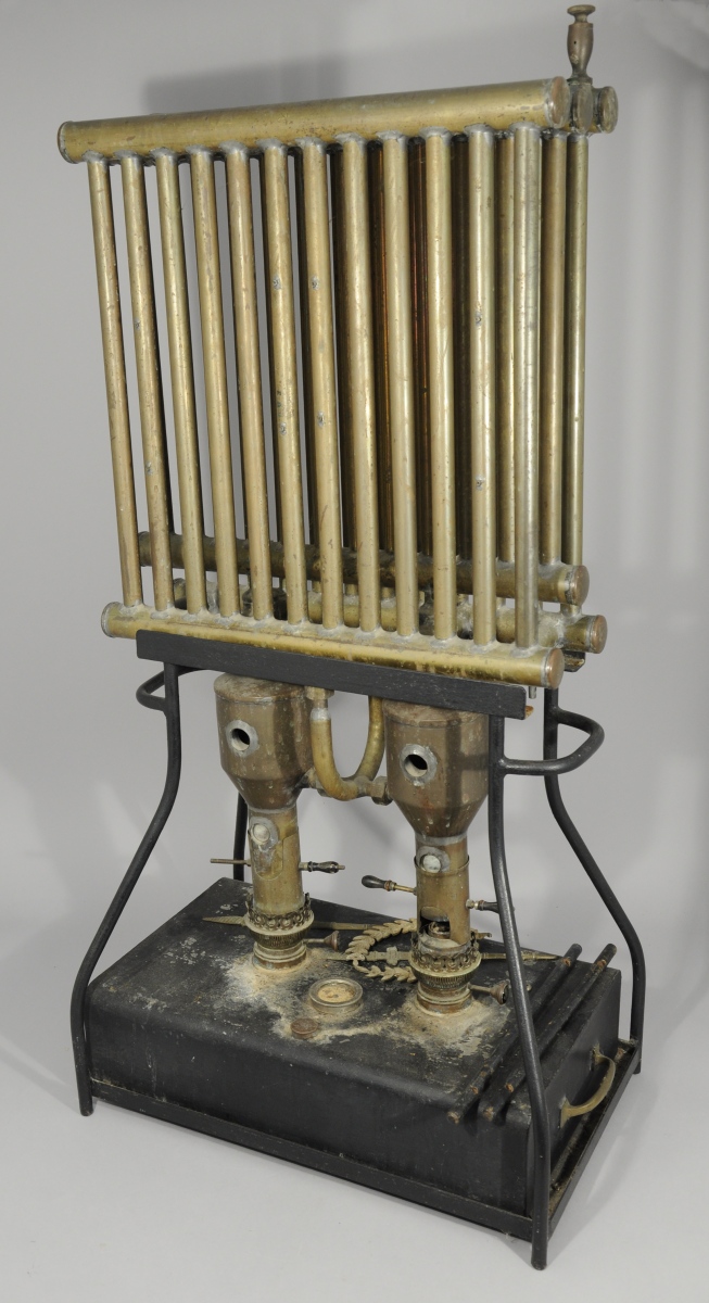 APPAREIL de CHAUFFAGE à deux feux de lampe a pétrole et trois rangs de tube en laiton pour l'eau. Il repose sur une base en tôle noire, avec poignées latérales. Ornementation de style Empire.