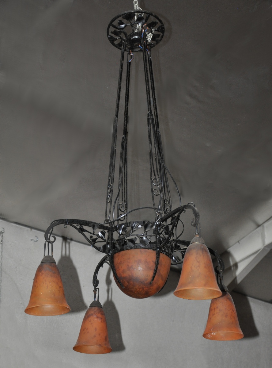 LUSTRE en fer forgé à quatre bras de lumière. Vasque centrale et quatre tulipes en verre marmoréen orange nuancé mauve. L'armature laquée noir à décor naturaliste ajouré de feuilles de ginkgo biloba. Les pièces de verre signées "Daum / Nancy / France".
