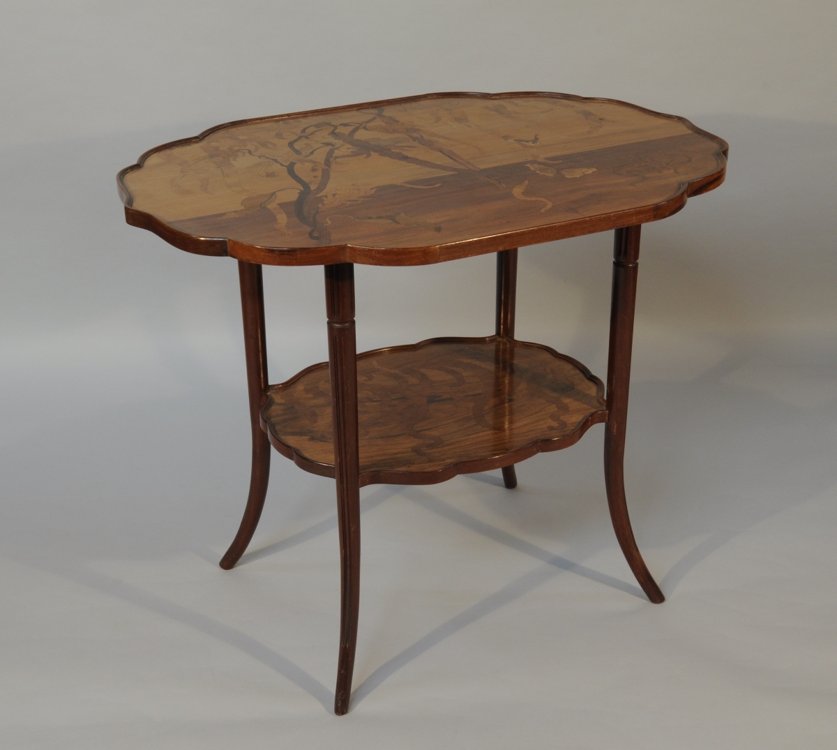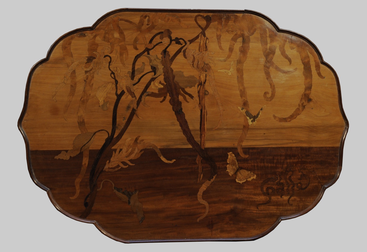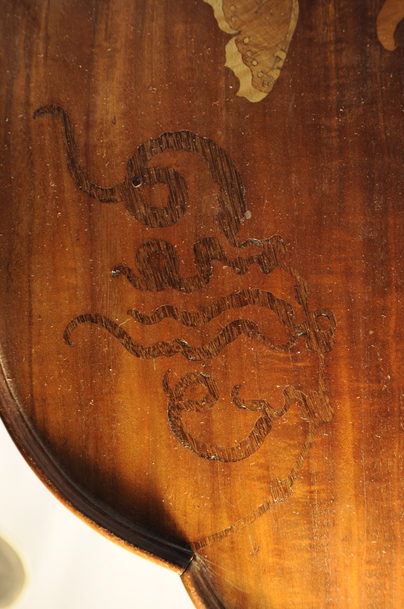 Émile GALLÉ (1846-1904). TABLE À THÉ en marqueterie à deux plateaux à décor de papillons sur fond de branchages fleuris. Quatre pieds à l'imitation du bambou.