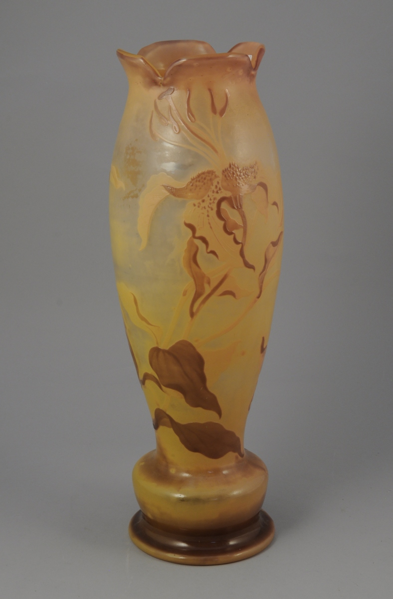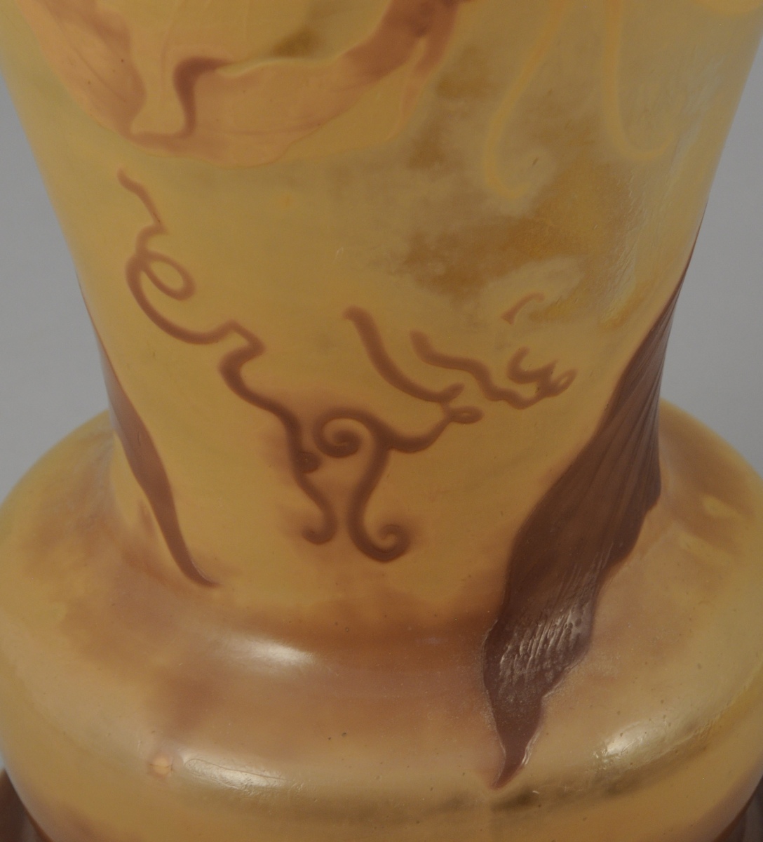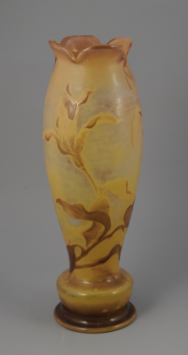 GALLÉ. VASE balustre à col quadrilobé en verre saumoné gravé dégagé à l'acide de lys sauvages. Base renflée.