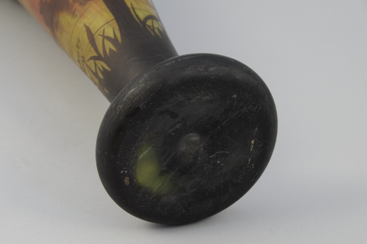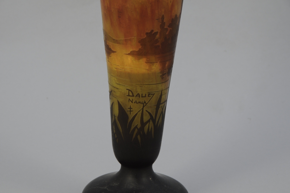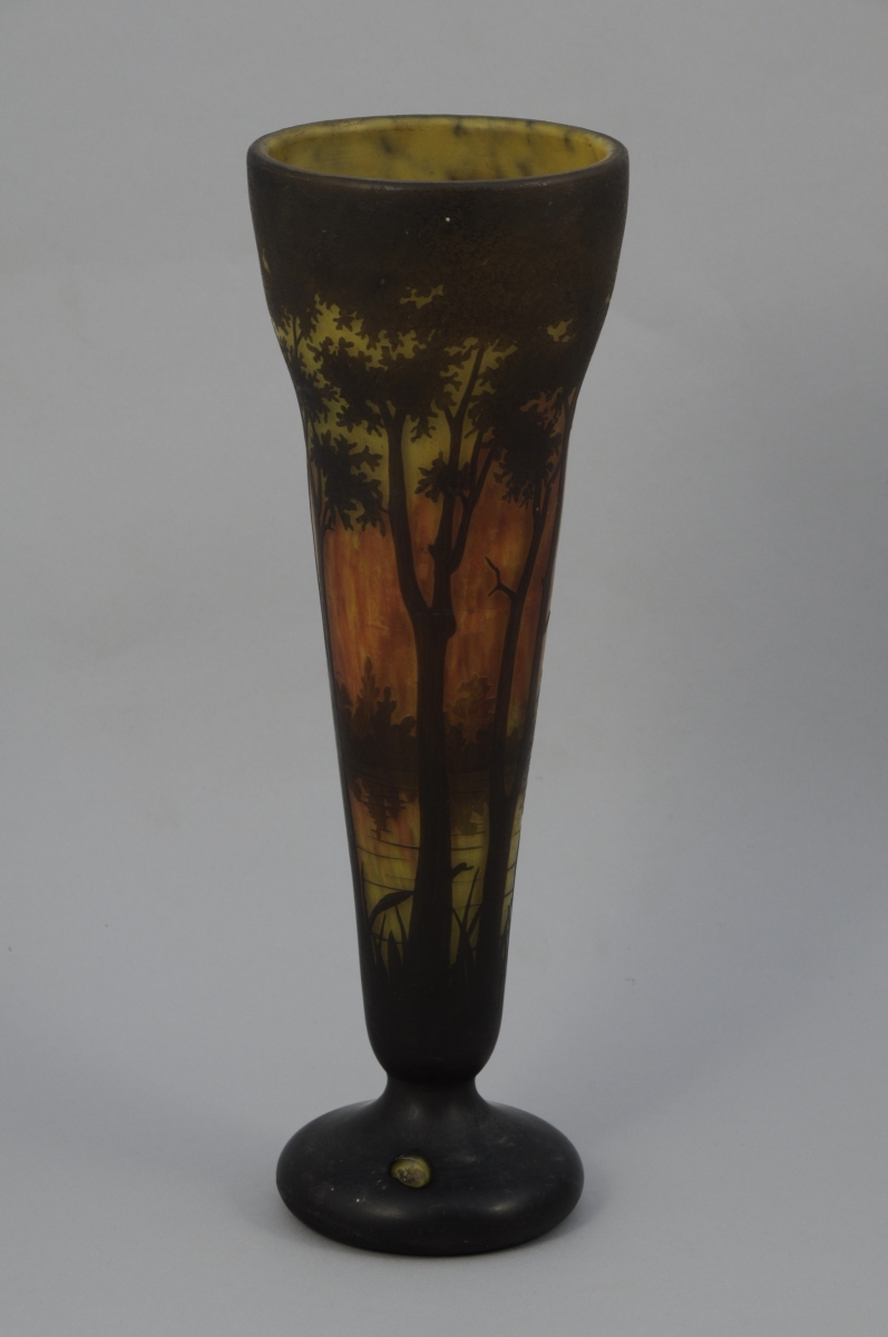DAUM. VASE tulipe à piédouche, en verre dégagé à l'acide, à décor sylvestre en bordure de lac.
