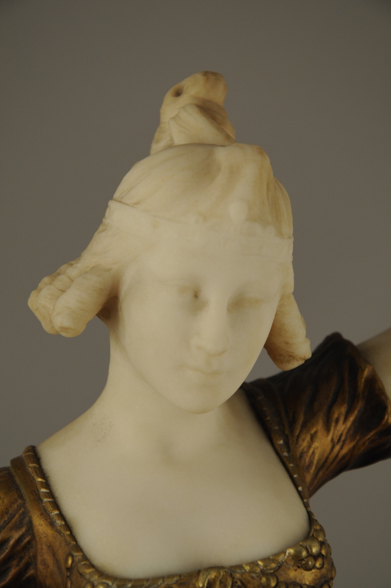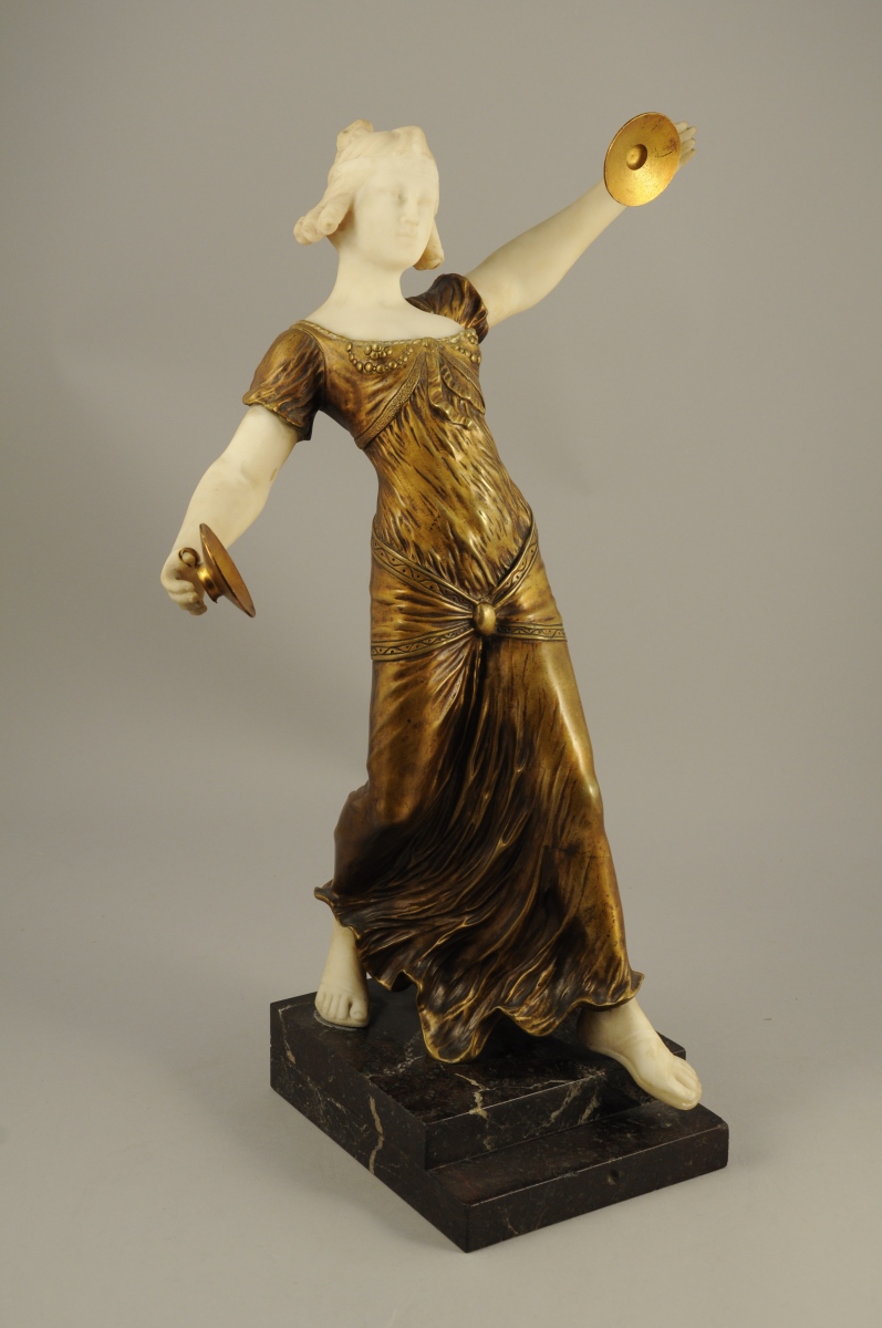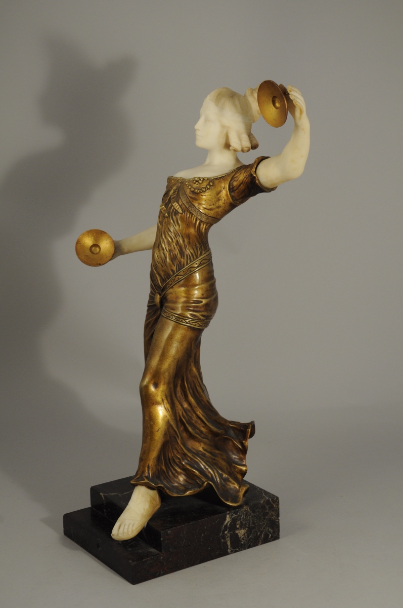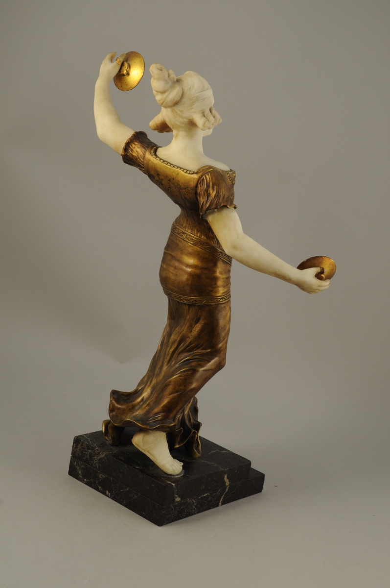 DANSEUSE ORIENTALE AUX CYMBALES en bronze mordoré patiné or et marbre blanc. Socle en marbre noir veiné rouge et blanc.