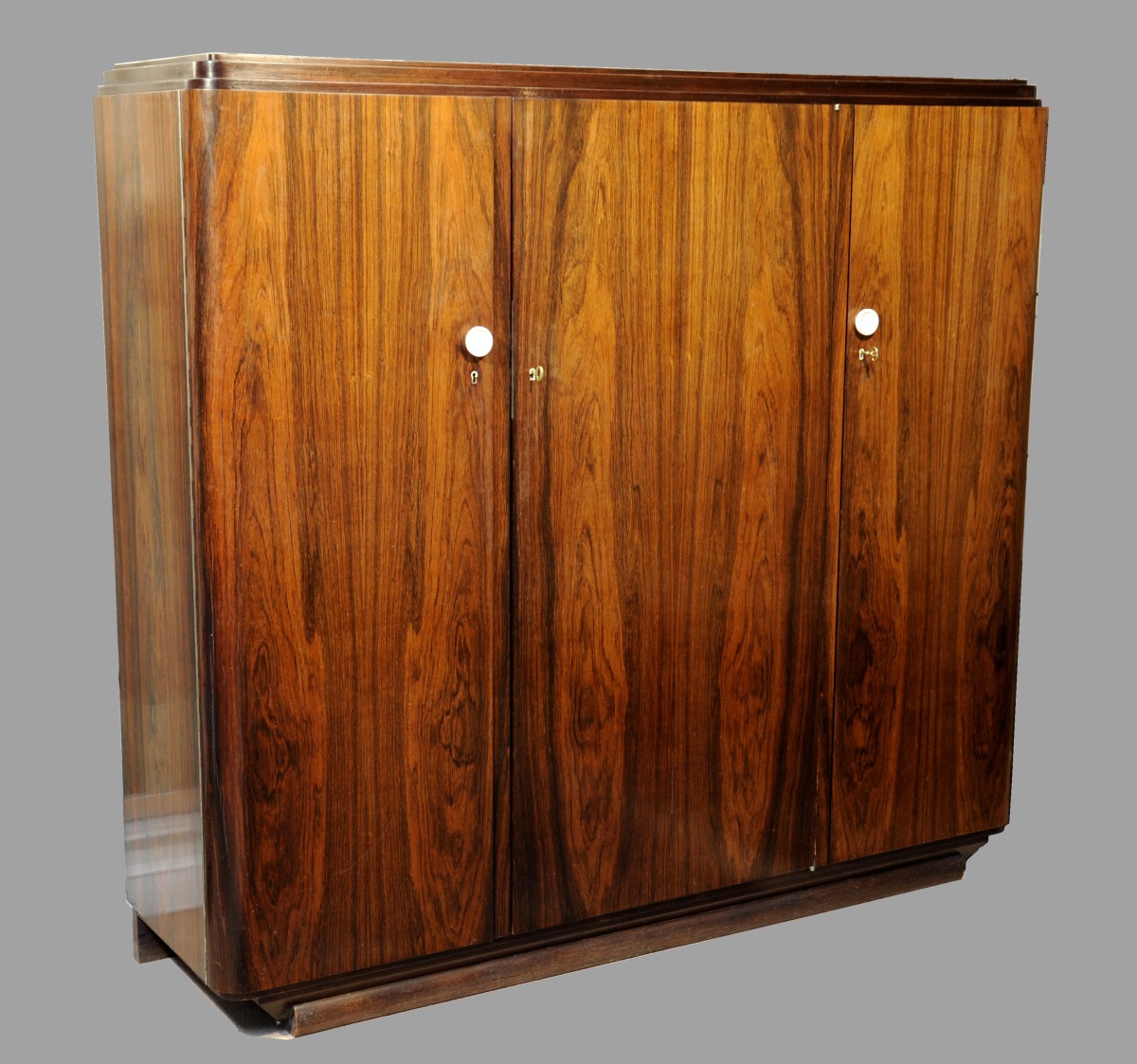 - ARMOIRE à corps géométrique surmontée d'une terrasse à triple gradin à la doucine. Elle ouvre à trois portes. Intérieur aménagé de douze étagères. Elle repose sur une plinthe cylindrique. Deux boutons de tirage en ivoire tourné. Entrées de serrure soulignées d'ivoire (manques).