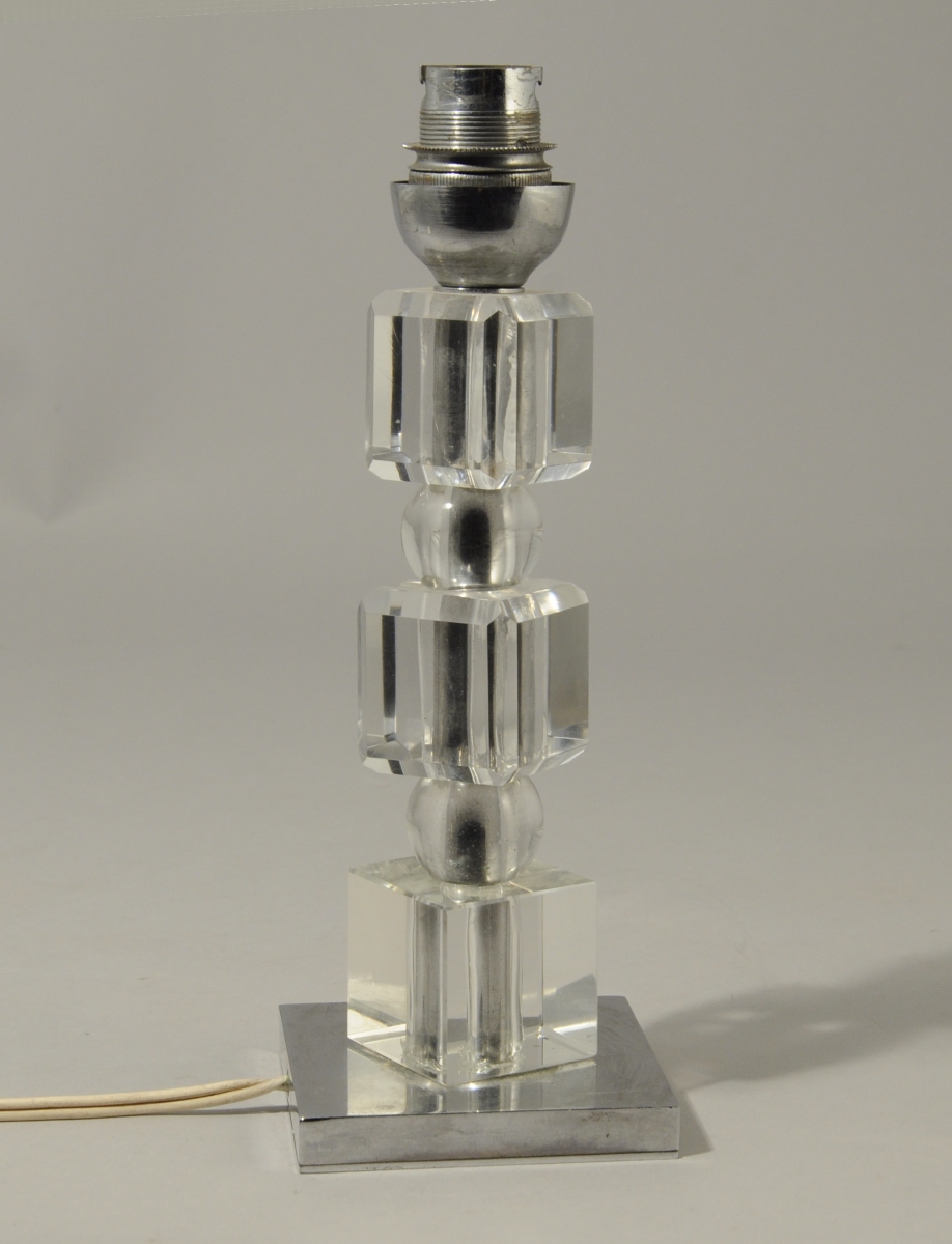 BOUGEOIR électrifié composé de trois cubes de cristal (?) sur un piétement en inox chromé.