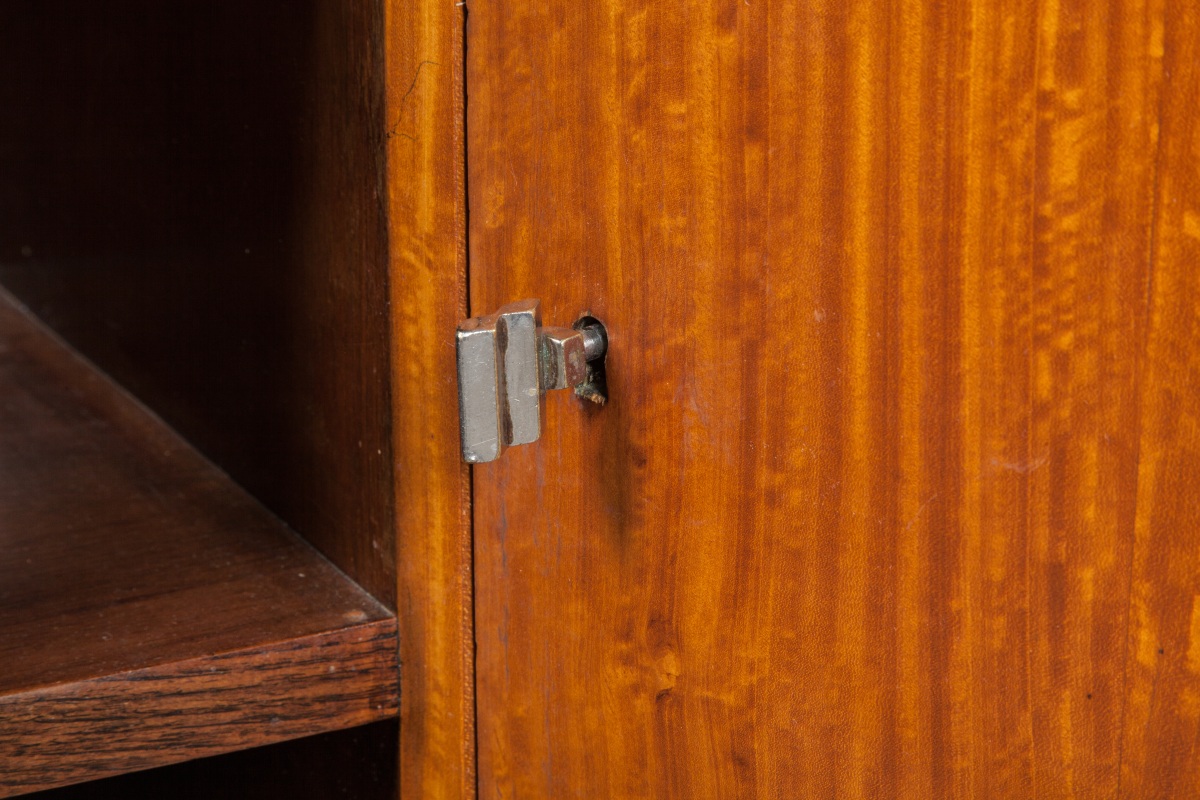 BUFFET d'ANGLE en placage de bois exotique. La partie centrale de forme hémisphérique à pans coupés est plaquée de bois clair. Elle ouvre sur trois étagères par un vantail arrondi décoré en son centre d'un médaillon marqueté d'ivoire et de bois précieux de motifs géométriques. Deux casiers ouverts plaqués de bois sombre, à quatre niveaux, encadrent la partie centrale à gauche et à droite. Le tout repose sur une estrade hémisphérique. Étiquette au dos n°"18707".