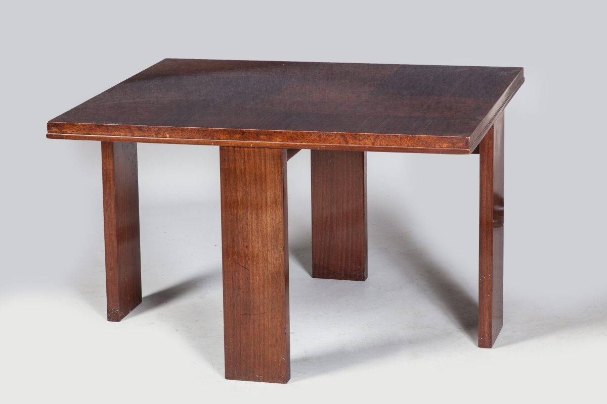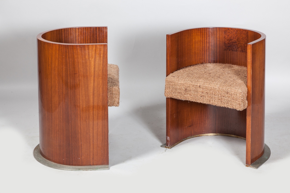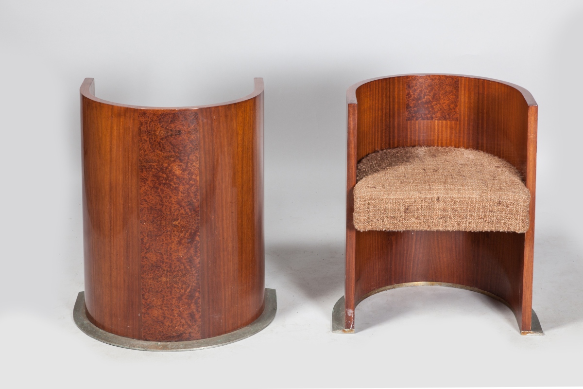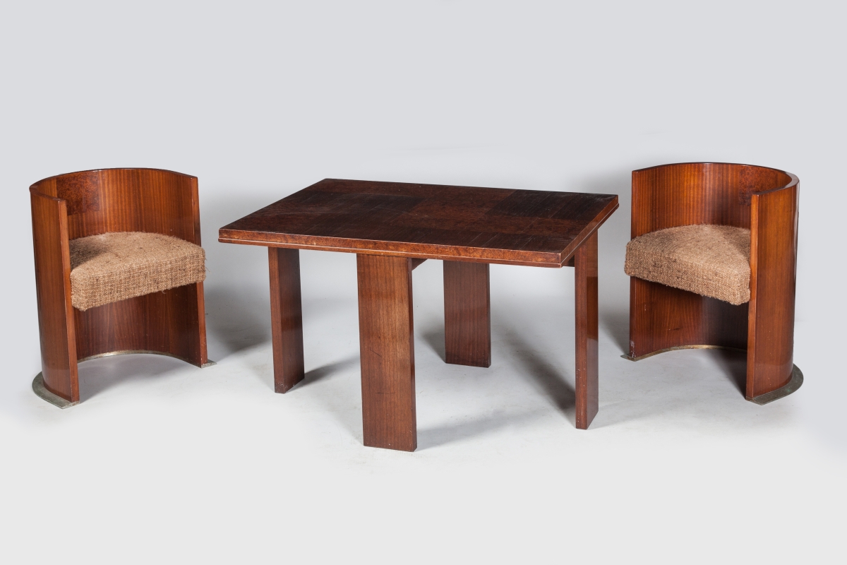 Cette luxueuse paire de chauffeuses, avec son subtil travail de placage et l'utilisation précoce du métal argenté, évoque tant les créations de Robert Mallet Stevens pour la villa de Paul Cavrois à Croix, que celles de René Prou, notamment pour des paquebots. Le piétement de la table et l'enchevêtrement des formes montrent, eux, de leur côté, l'influence de Jean Dunand.