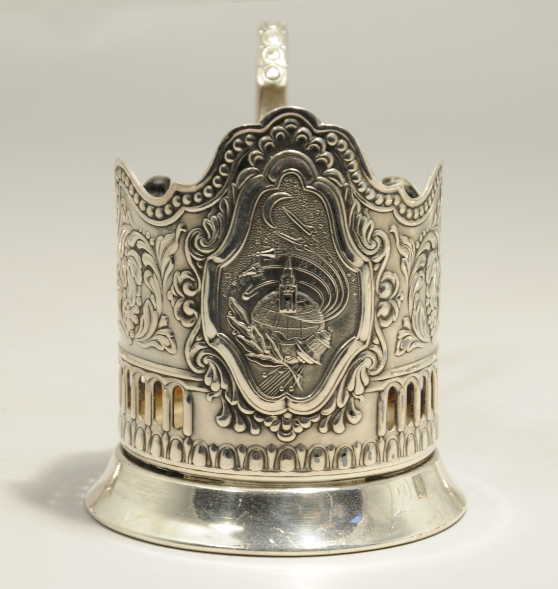 5 PORTE-VERRES en métal argenté des TRAINS SOVIÉTIQUES, l'un figurant une allégorie de la paix, les quatre autres magnifiant les exploits spatiaux russes avec représentation du spoutnik et des fusées intercontinentales.