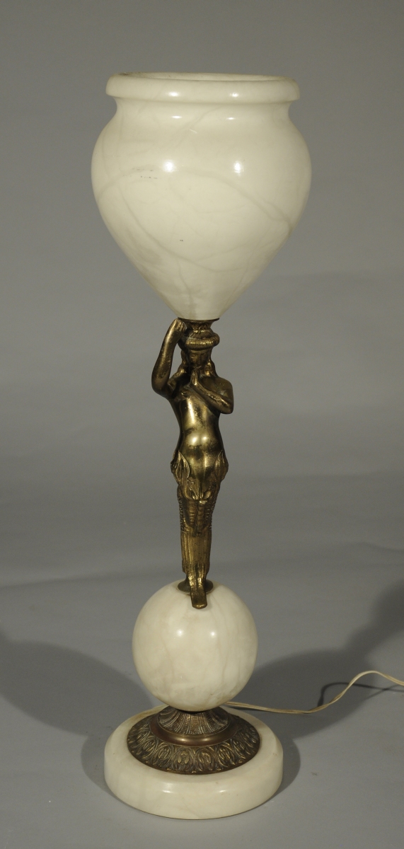 - LAMPE À LA SIRÈNE figurant une sirène en bronze supportant une vasque piriforme reposant sur une sphère en albâtre. Socle en bronze de forme ronde, agrémenté d'une frise circulaire de feuillages stylisés. Haut. 61, Diam. 16,5 cm.