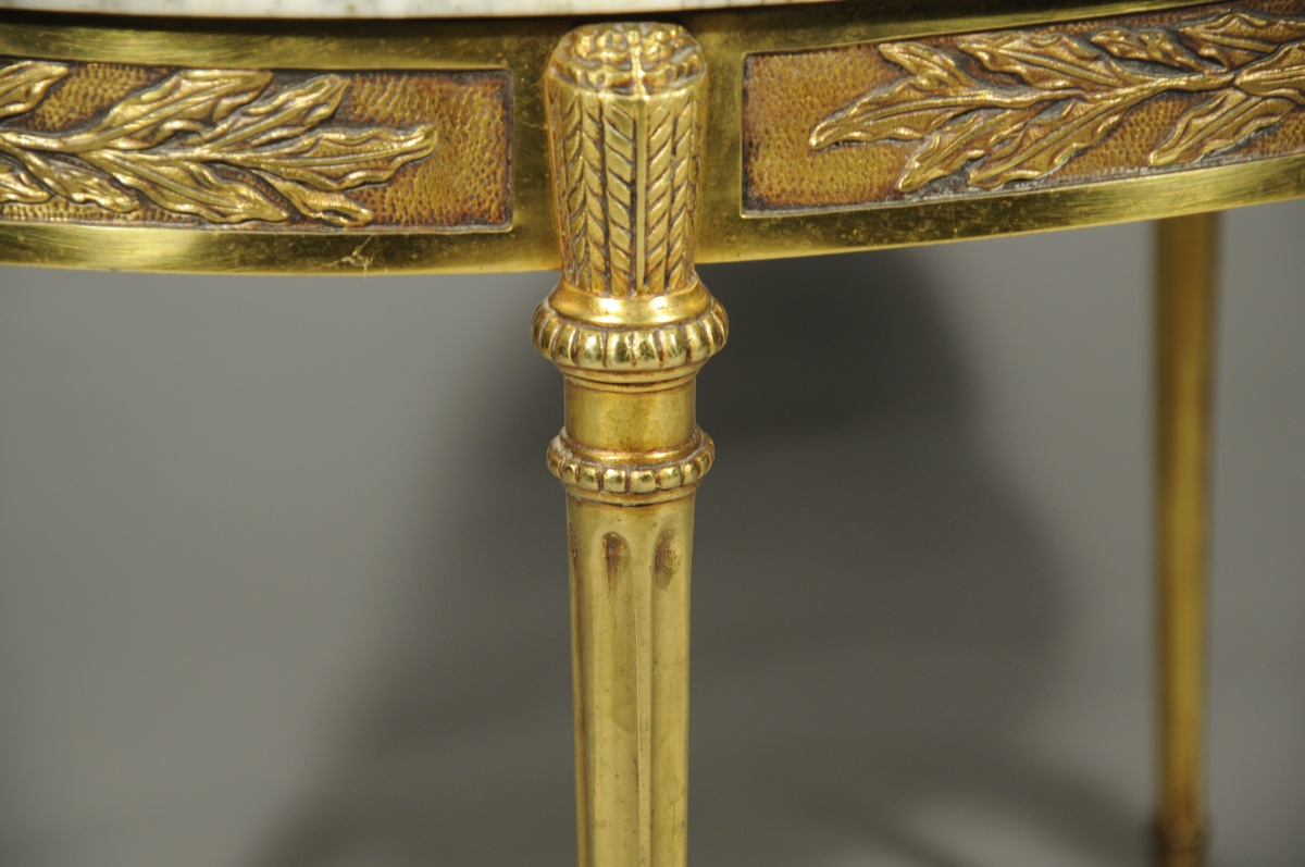 - TABLE BASSE de forme ovale en bronze. Elle repose sur quatre pieds fuselés et cannés adoptant la forme de carquois et terminés par des feuillages stylisés. La ceinture ornée de branches de lauriers. Dessus de marbre blanc veiné gris. Style Louis XVI. Haut. 48, Long. 82, Larg. 55 cm. (un pied enfoncé)