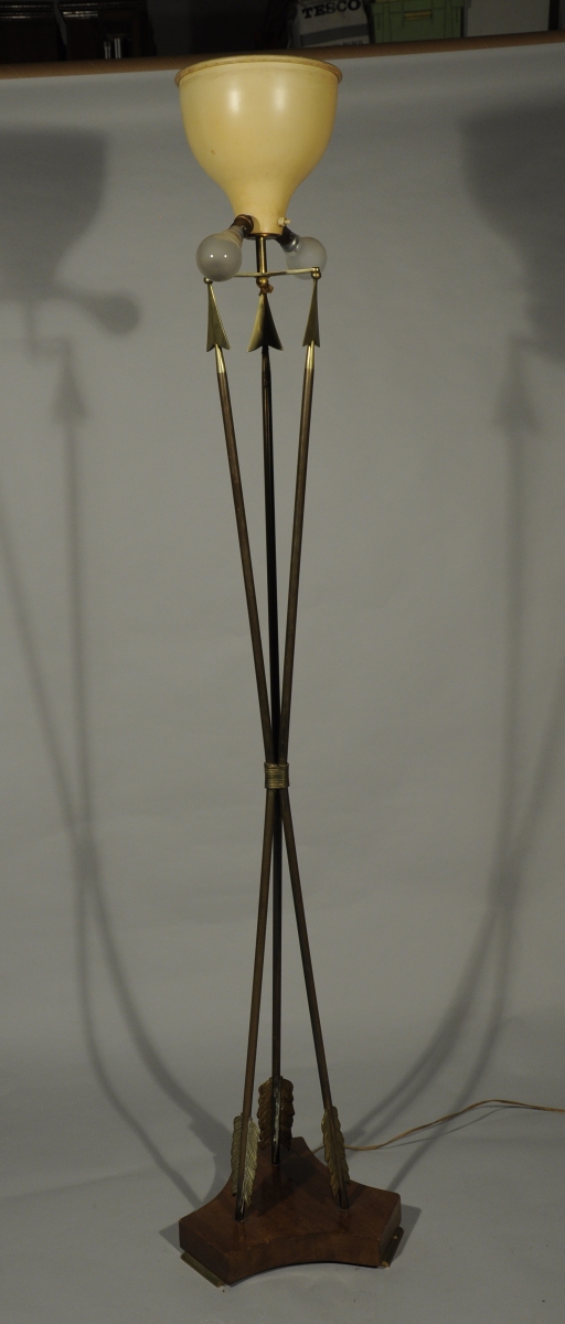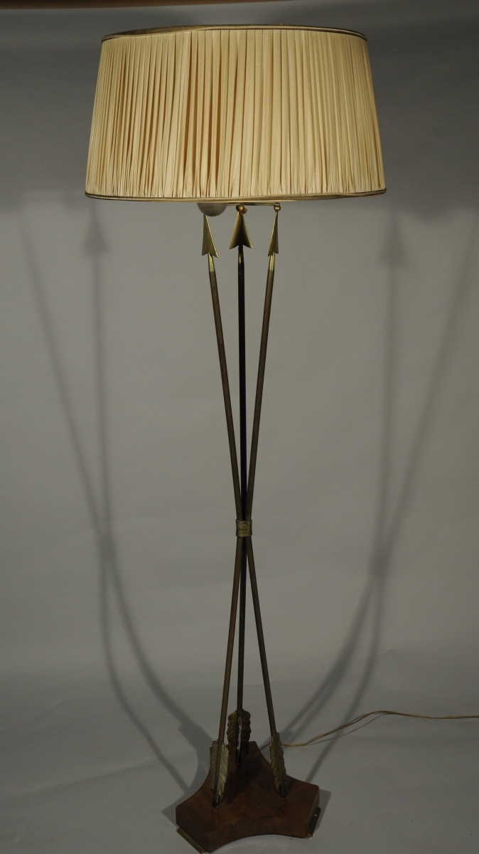 - LAMPADAIRE en laiton. Le fût formé de trois flèches entrecroisées. Socle en bois.